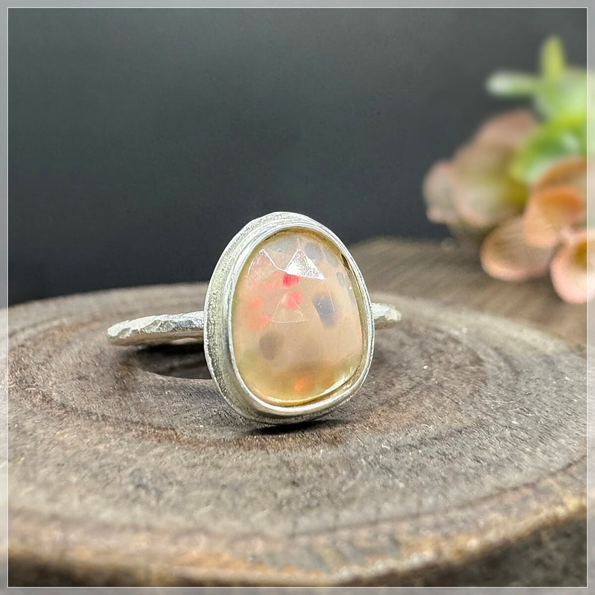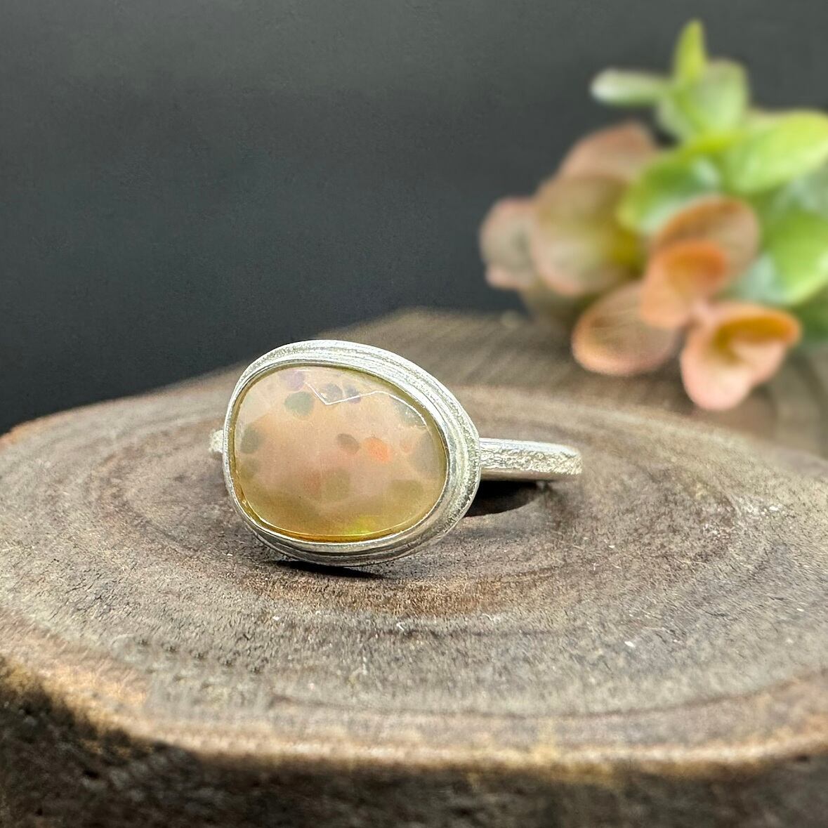 パッと見は落ち着いた薄い茶色のオパールですが、動かすとしっかりと遊色が見え、ついつい指をチェックしたくなる可愛い指輪になりそうです。