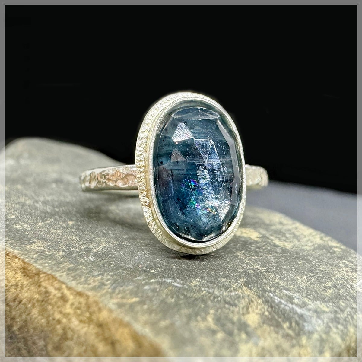 石の内側から見える輝きとローズカットの両方でキラキラして、落ち着いた深いカイヤナイトの色が神秘的な雰囲気のある指輪になりそうです。