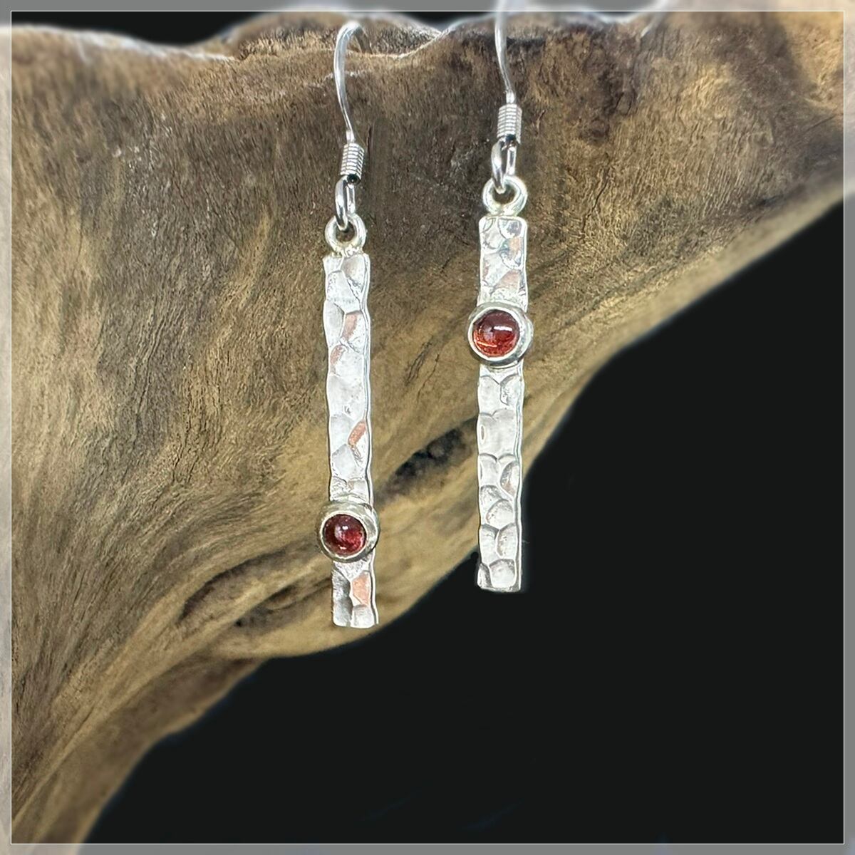 平たくしたシルバーにポコポコした槌目を入れて、小さなガーネットは一つは上、一つは下の方につけました。