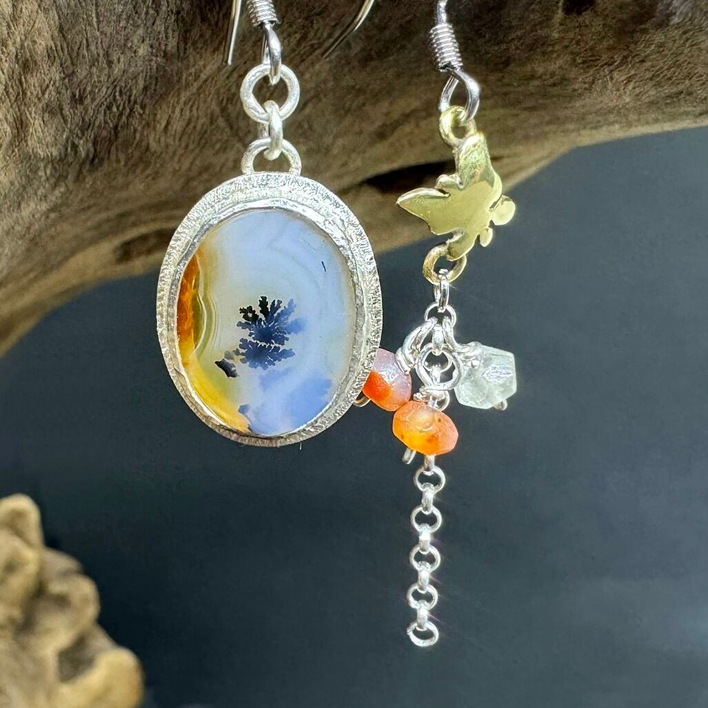石の色が明るい雰囲気だったので、もう片方には真鍮で作った小さな蝶を合わせ、更に小粒のオレンジ系のアゲートをぶら下げてカラフルにしています。