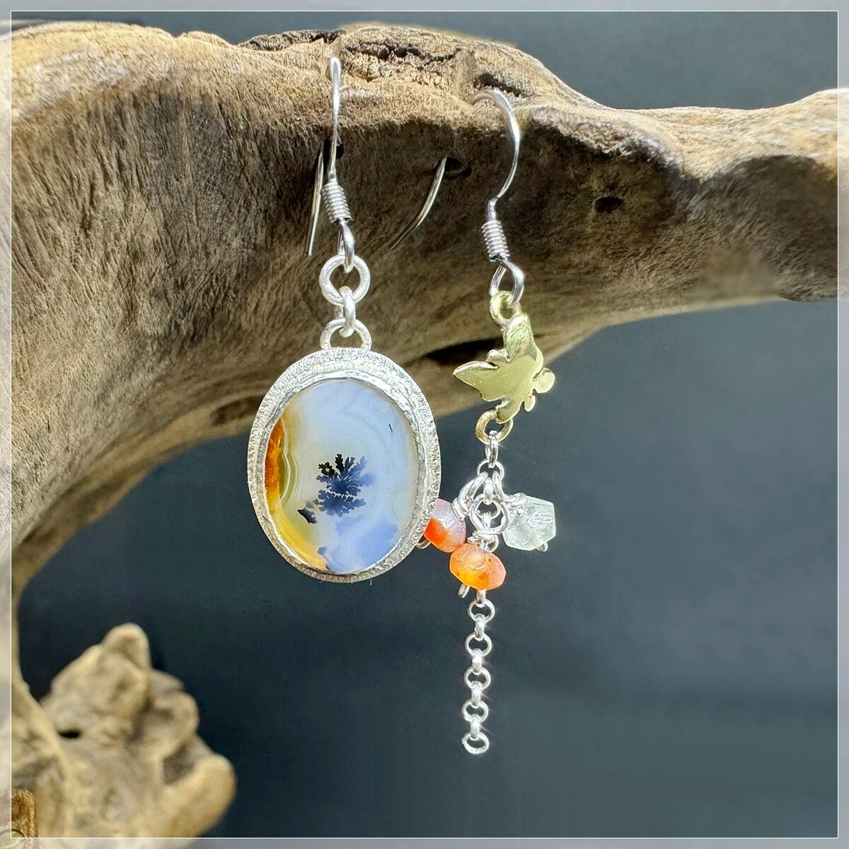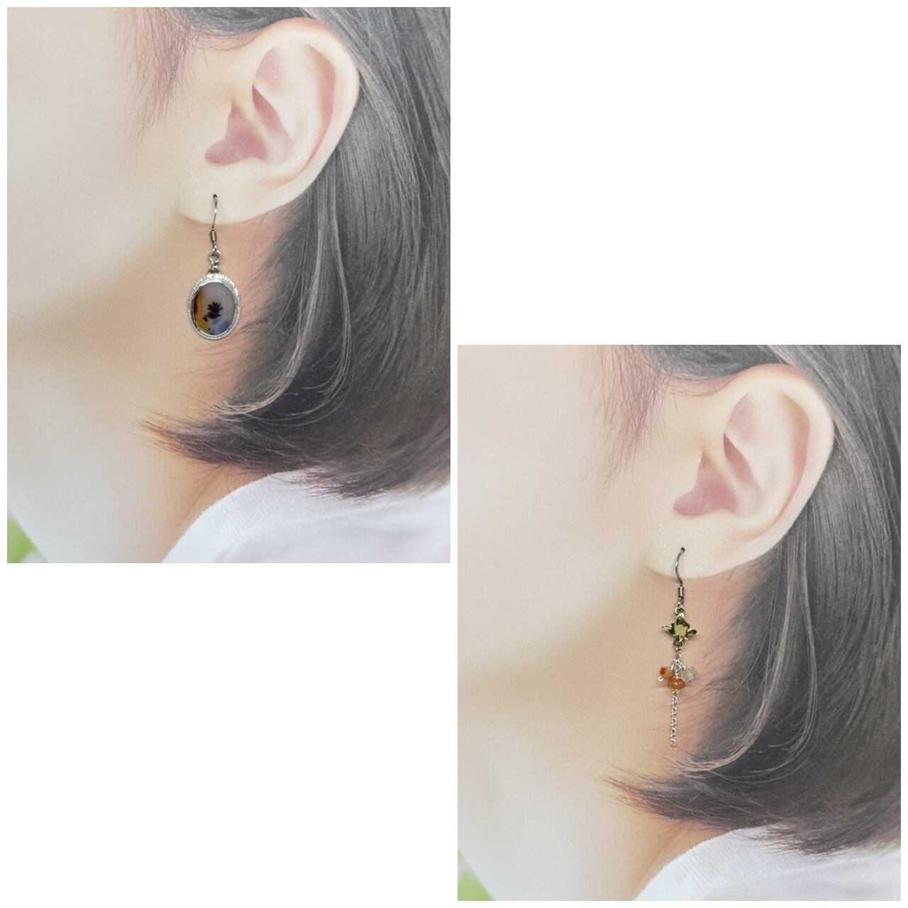 小さめ楕円形のデンドリティックアゲートを使ったアシンメトリーピアスです。