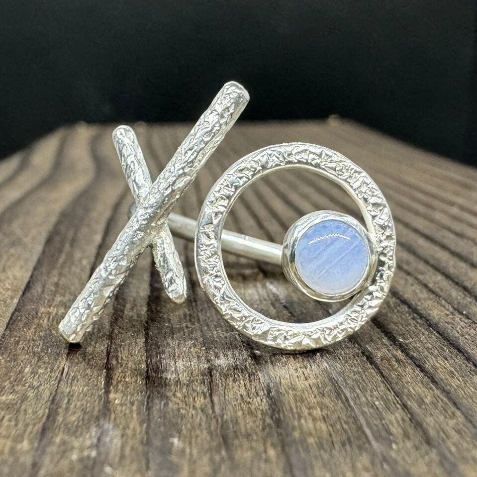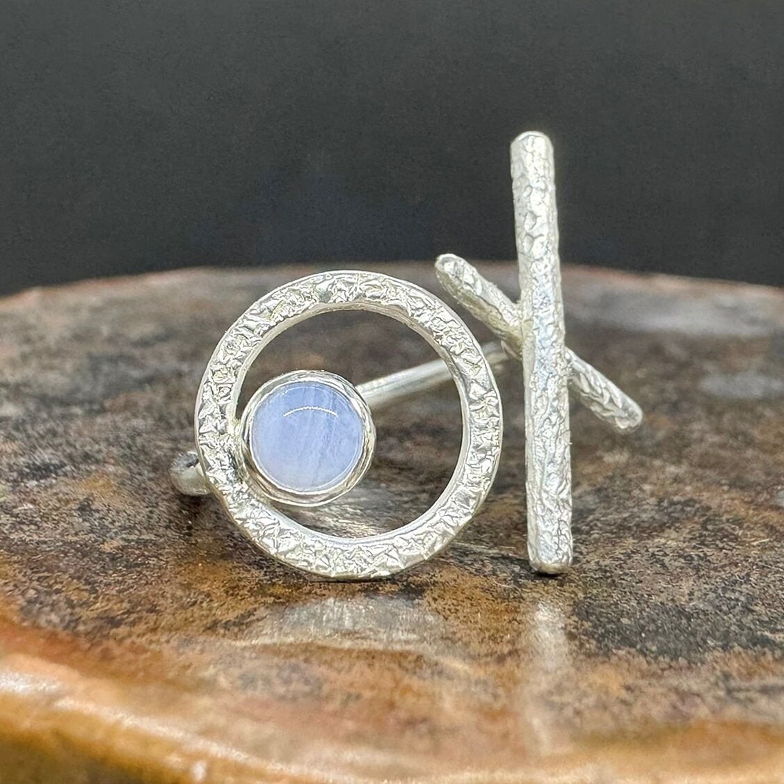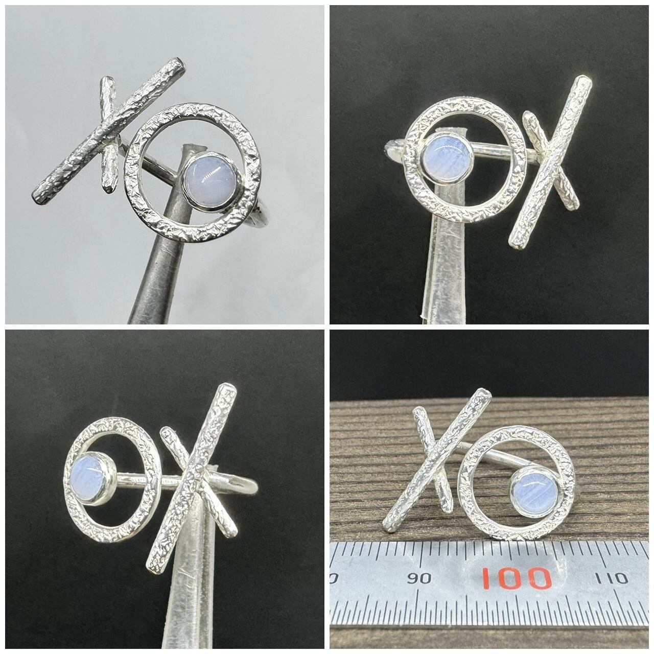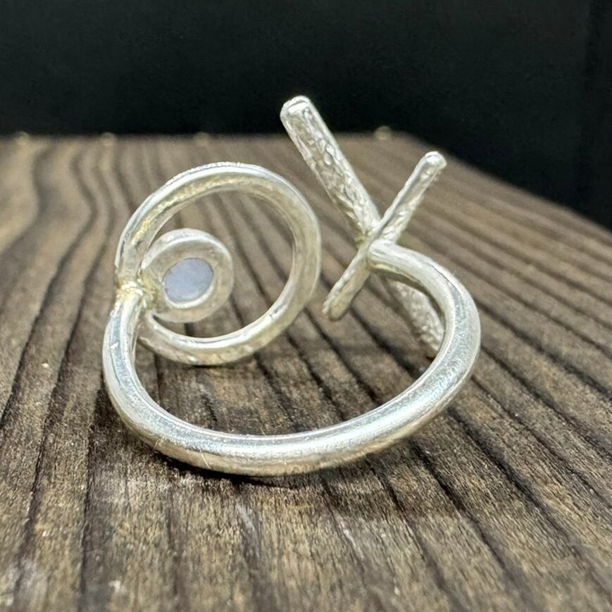 石はシンプルにシルバーで囲み、石座として大きめの丸を合わせて透け感のあるデザインにして丸の表面には細かな槌目をいれました。