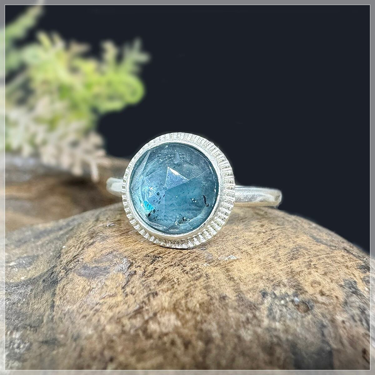 透明感のあるティールカラーでローズカットがキラキラする、爽やかで涼し気な印象の指輪になりそうです。