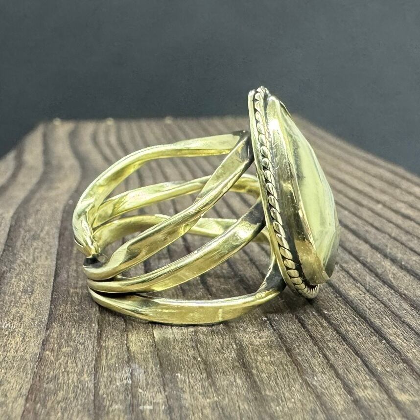 アーム部分は平たい3本の真鍮線をひねって動きを出し、石の雰囲気に合わせて流れるようなデザインにしました。