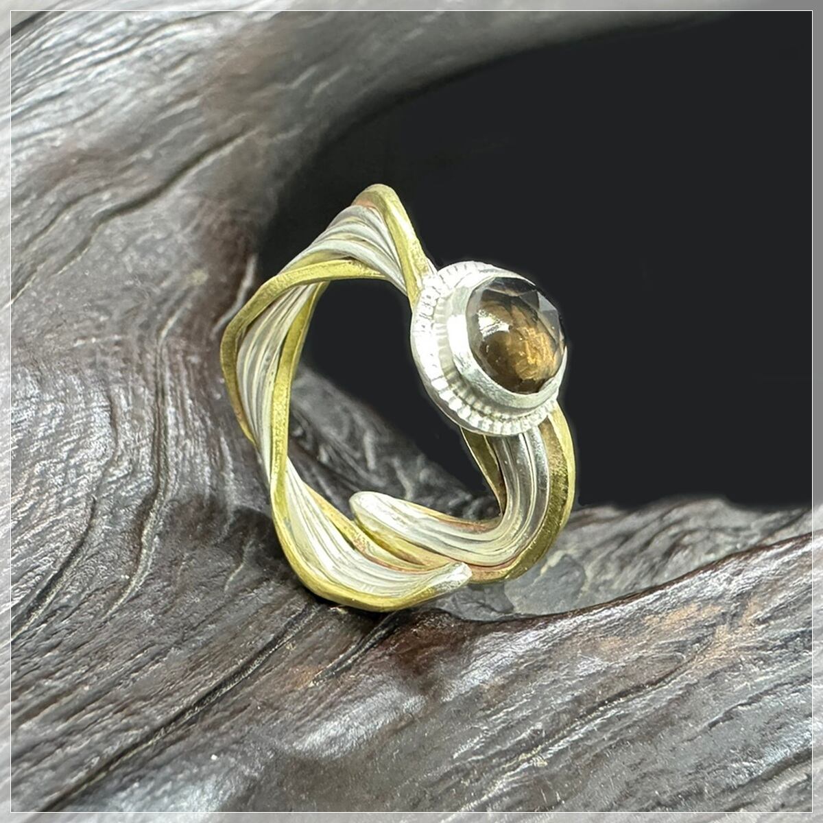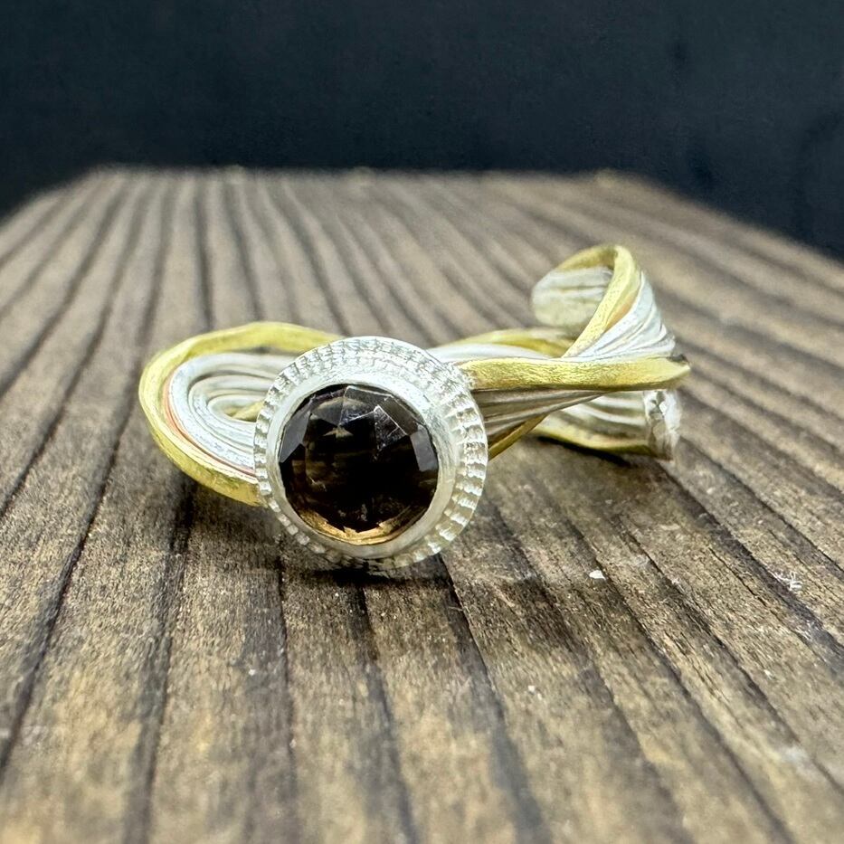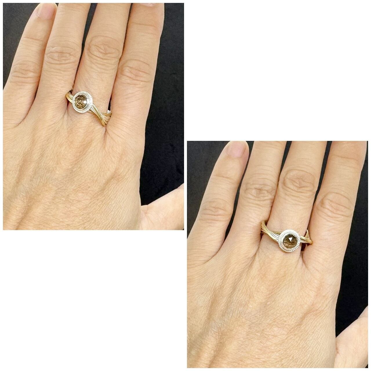 落ち着いた茶色がカッコイイスモーキークォーツと動きのあるデザインで個性的な指輪になりました。