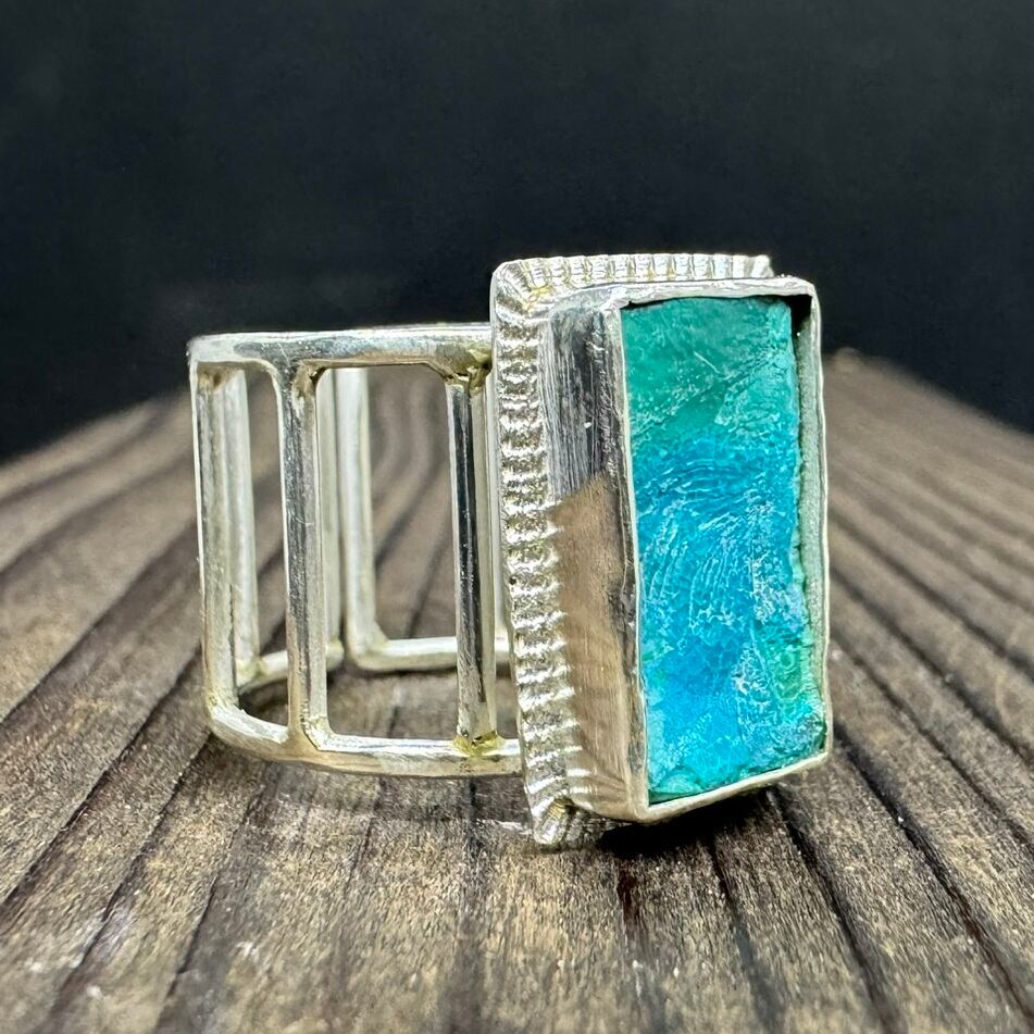 ブルーグリーンが印象的なクリソコラの指輪です。