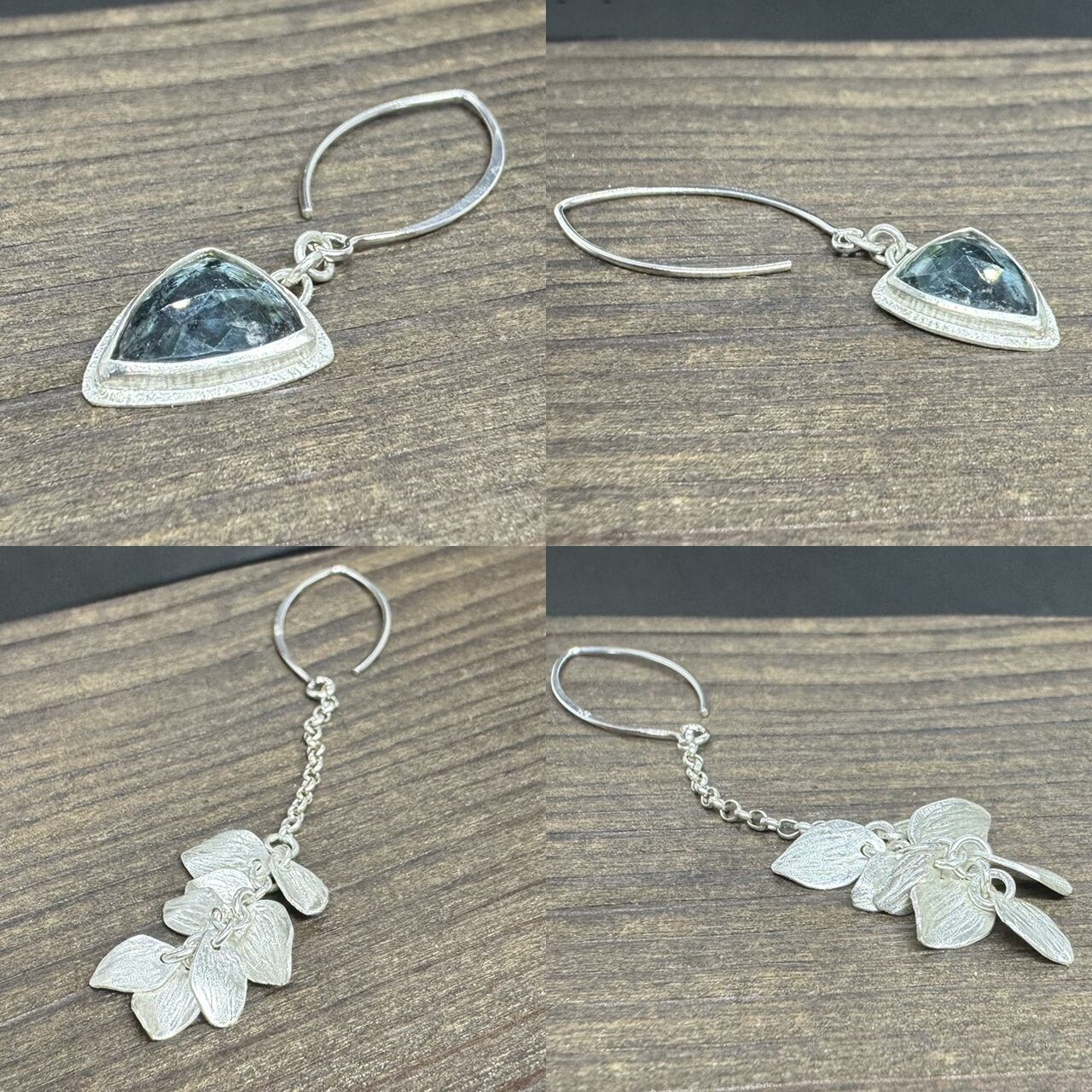 もう片方は石の形から花びらを連想し、シルバーの花びらモチーフを重ね合わせ、シャラシャラした繊細な印象で仕上げました。