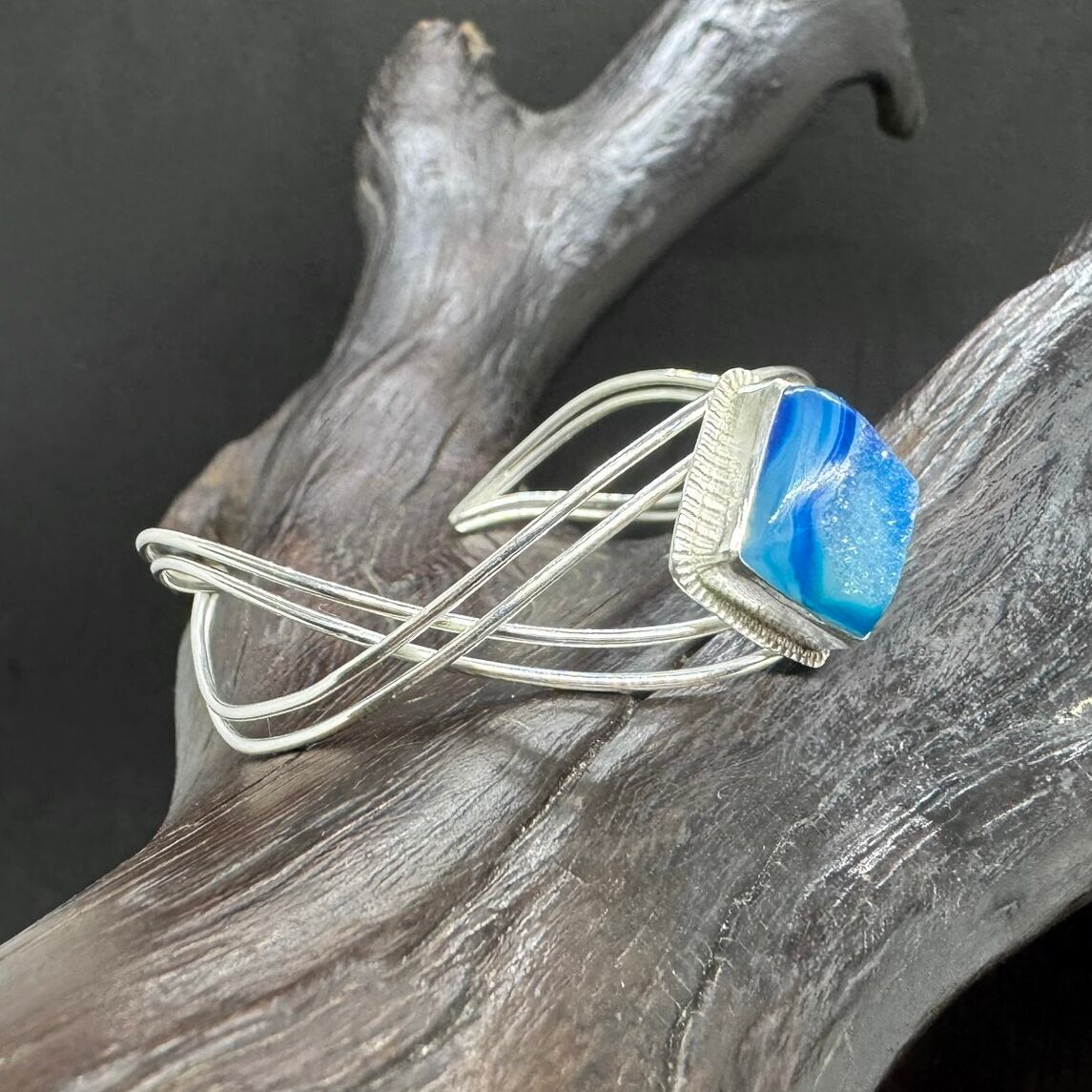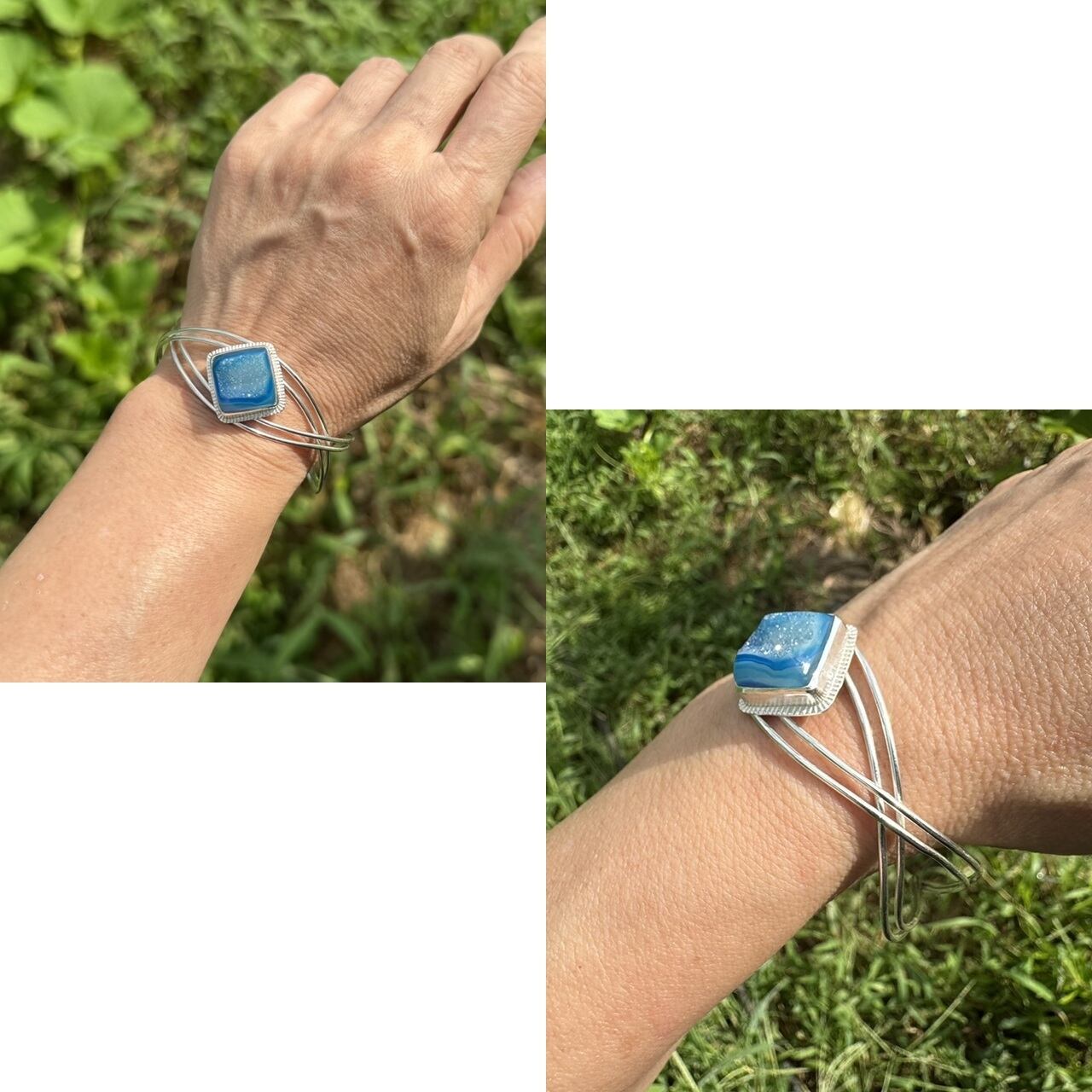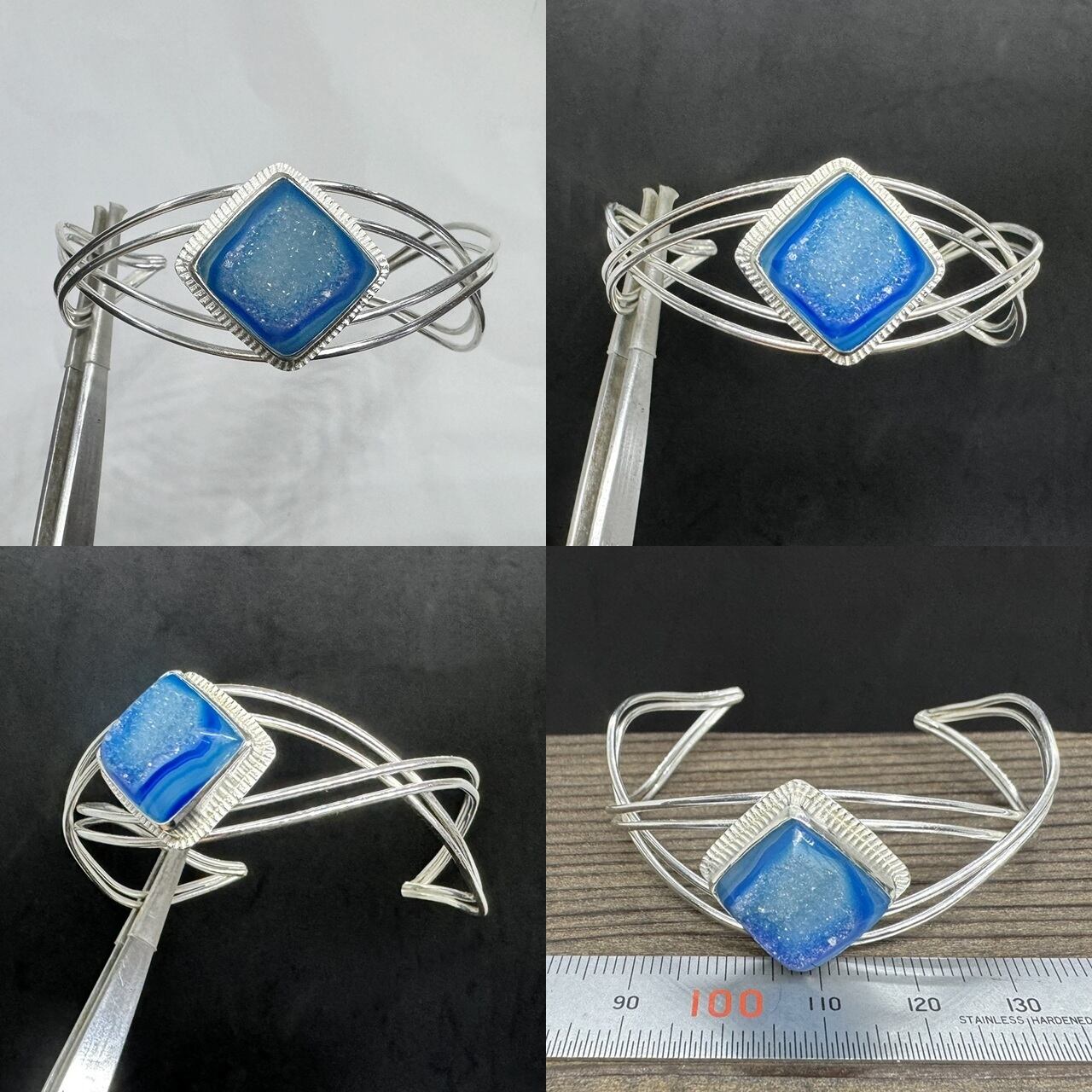華奢で繊細なラインの中に鮮やかなブルーがキラキラ光る存在感のあるバングルになりました。