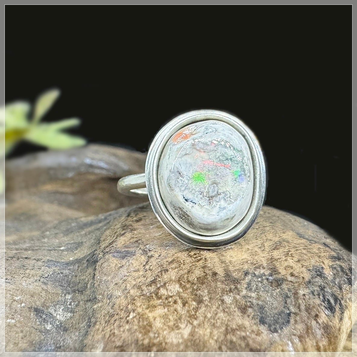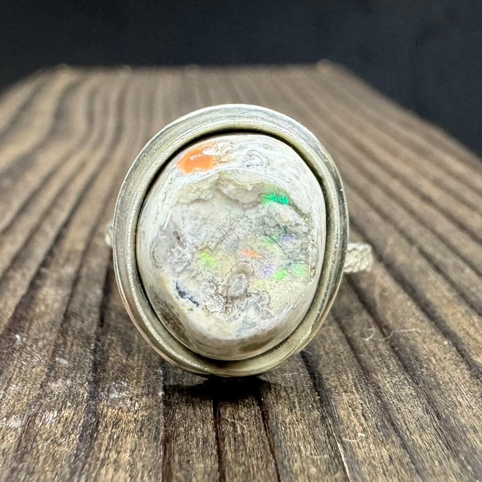 柔らかい遊色が見える、オパールの魅力たっぷりの存在感のある指輪になりそうです。