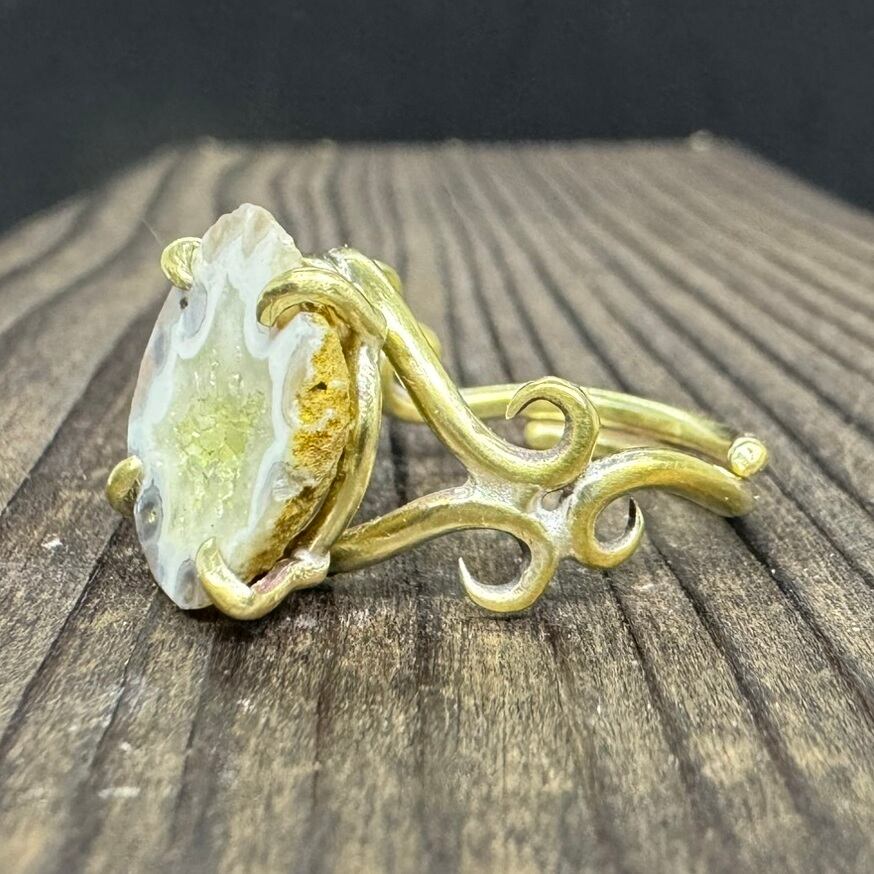 石の模様と真鍮アームのデザインが楽しい個性的なリングになりました。