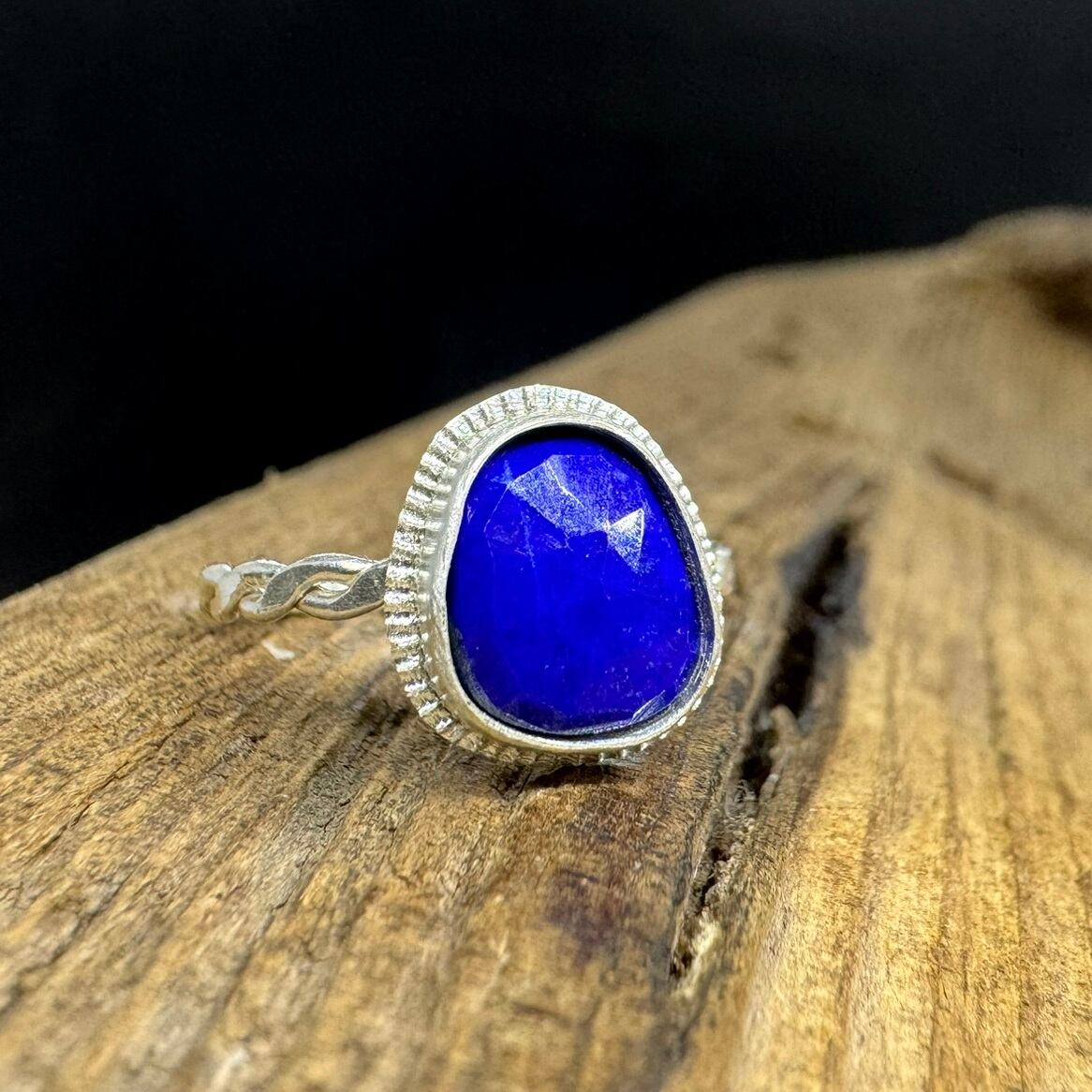 キリッとした瑠璃色とローズカットがカッコイイ普段使いにぴったりのリングになりそうです。