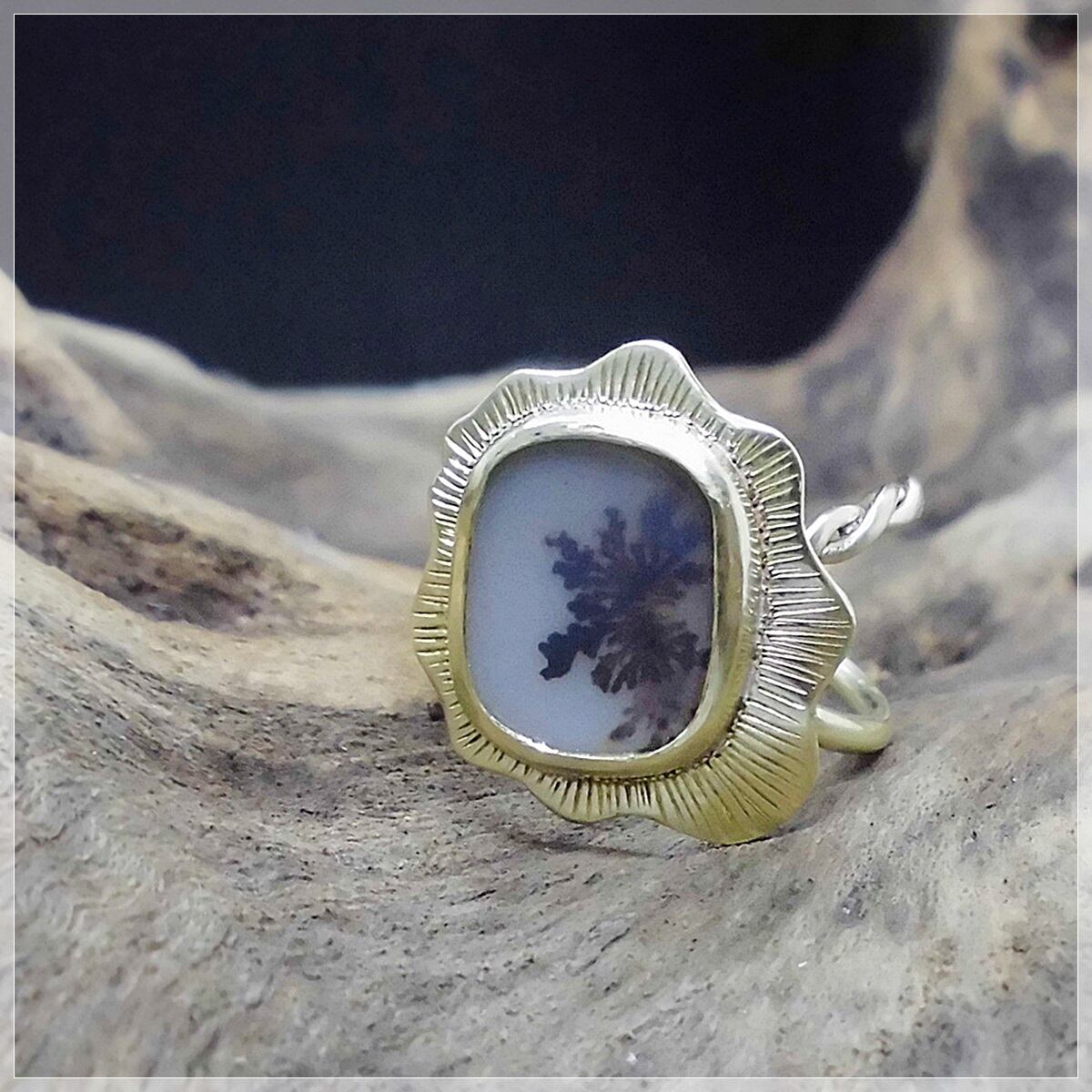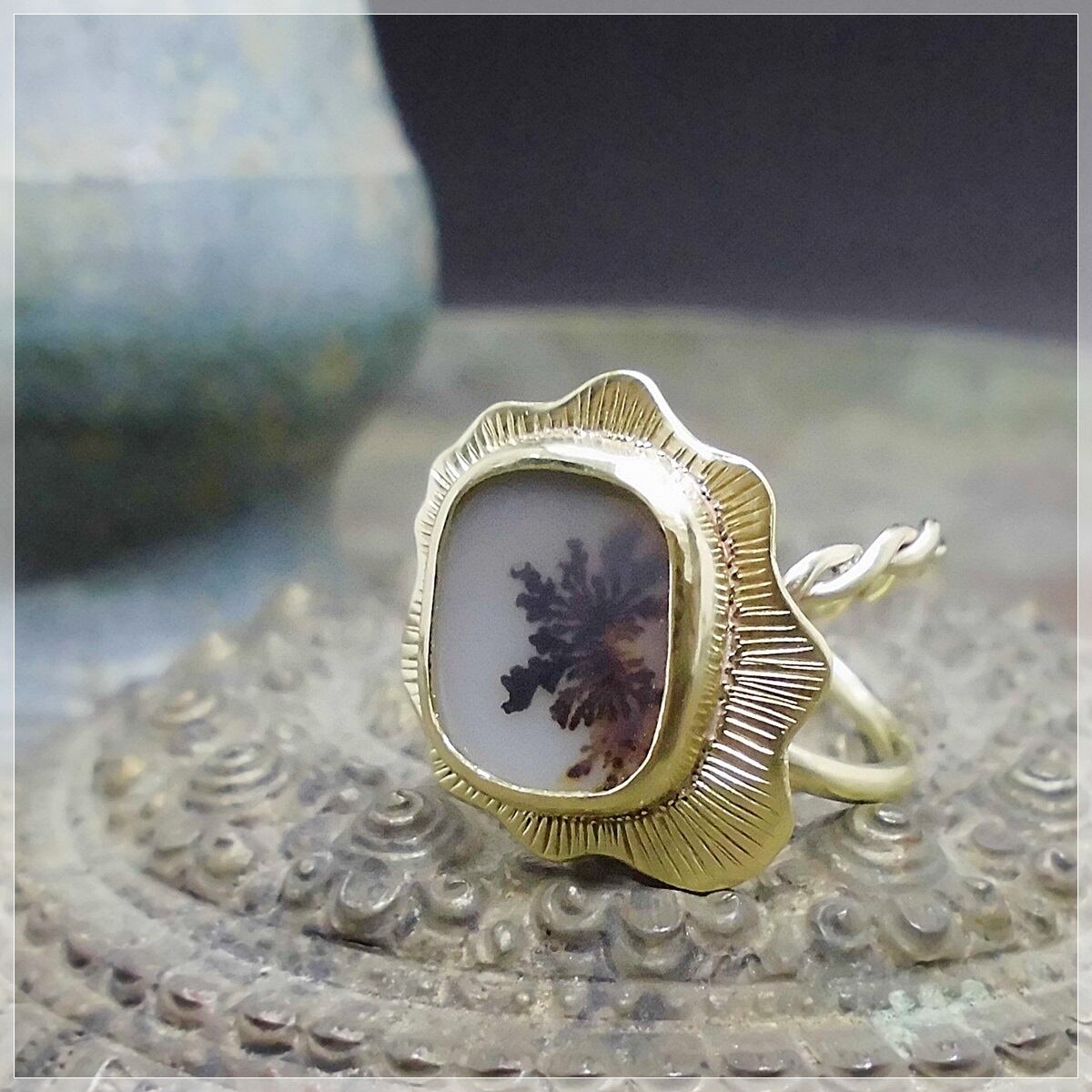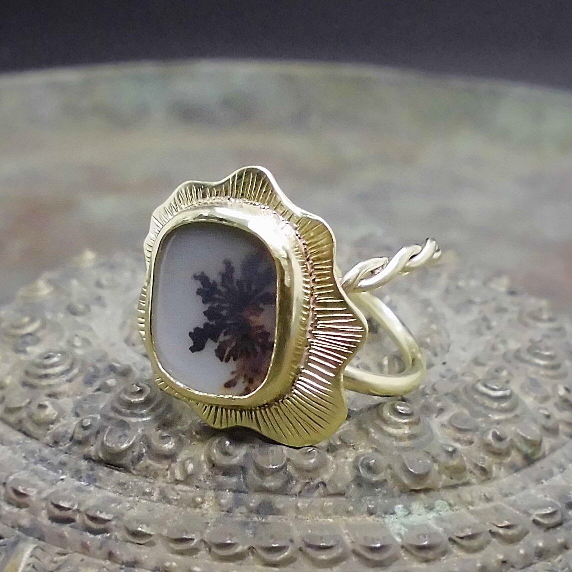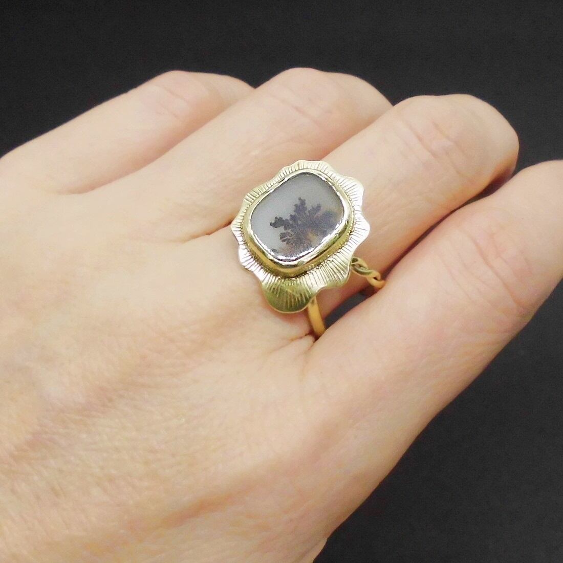 絵画のような樹木模様が美しいデンドリティックアゲートに、周りに植物のような模様を合わせた指輪です。