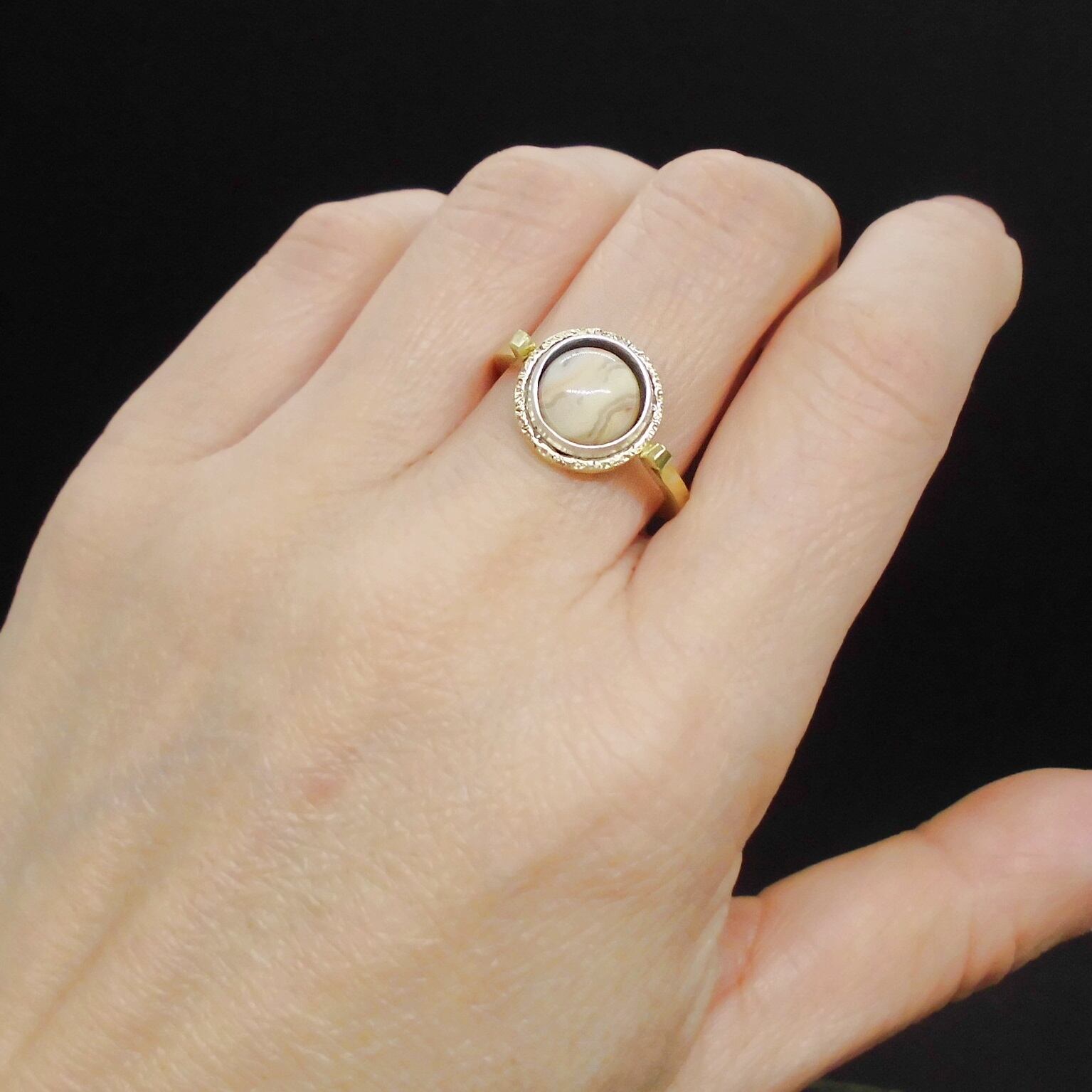 個性的な縞模様が可愛いクレイジーレースアゲートに、細身のスクエア真鍮アームを合わせます。