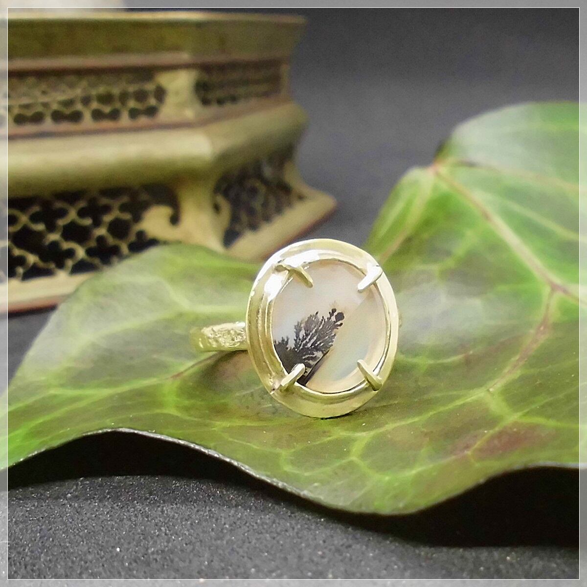 絵画のような樹木模様が可愛いデンドリティックアゲートに、真鍮の個性的なフレームを合わせました