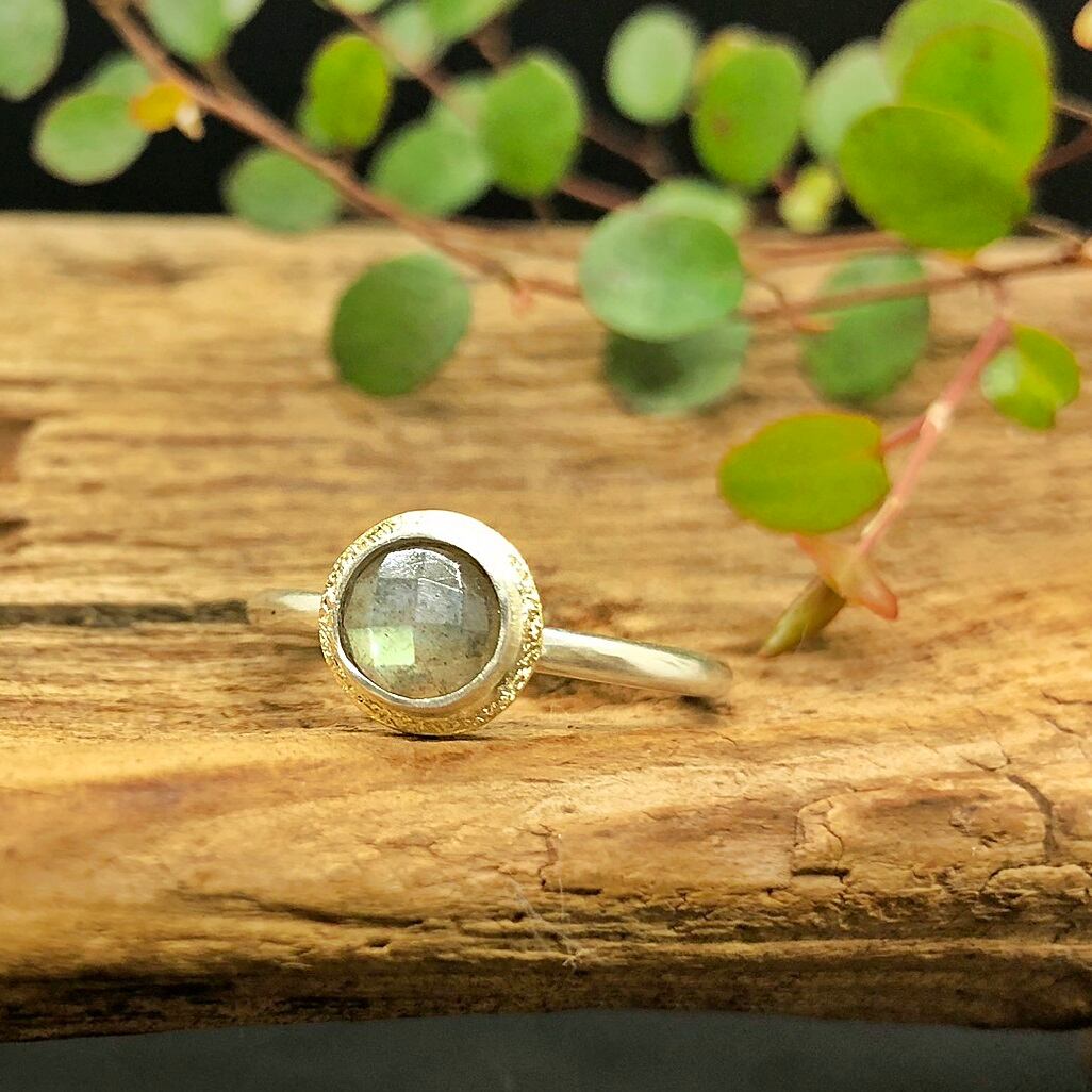 角度によってシラーが綺麗に見えるラブラドライトに、真鍮の上品な縁取りとシンプルなシルバーアームを合わせます