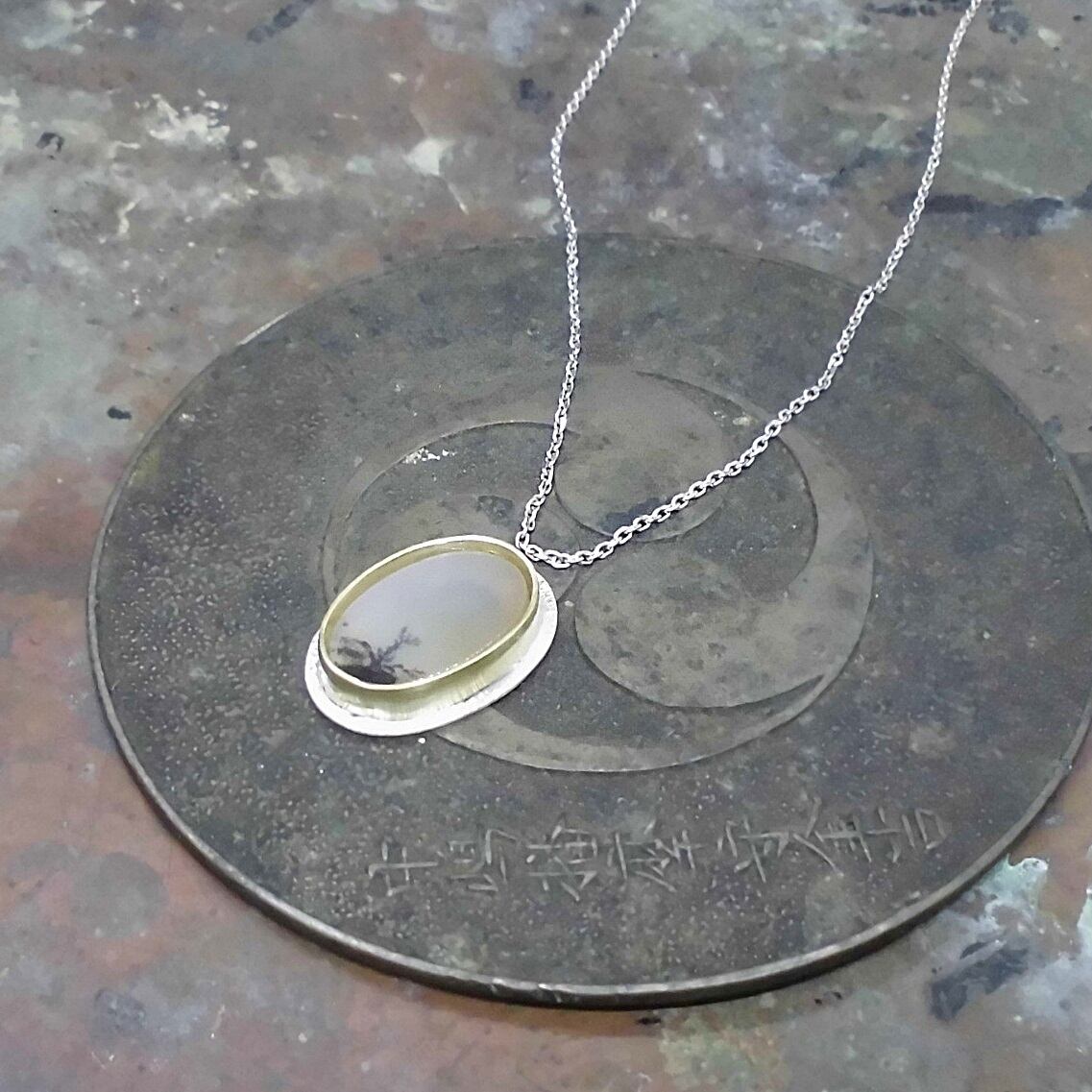 小さな木の模様が絵画のようなデンドリティックアゲートに、繊細なシルバーフレームを合わせて、シンプルな真鍮アームで仕上げます。
