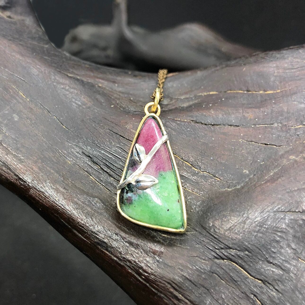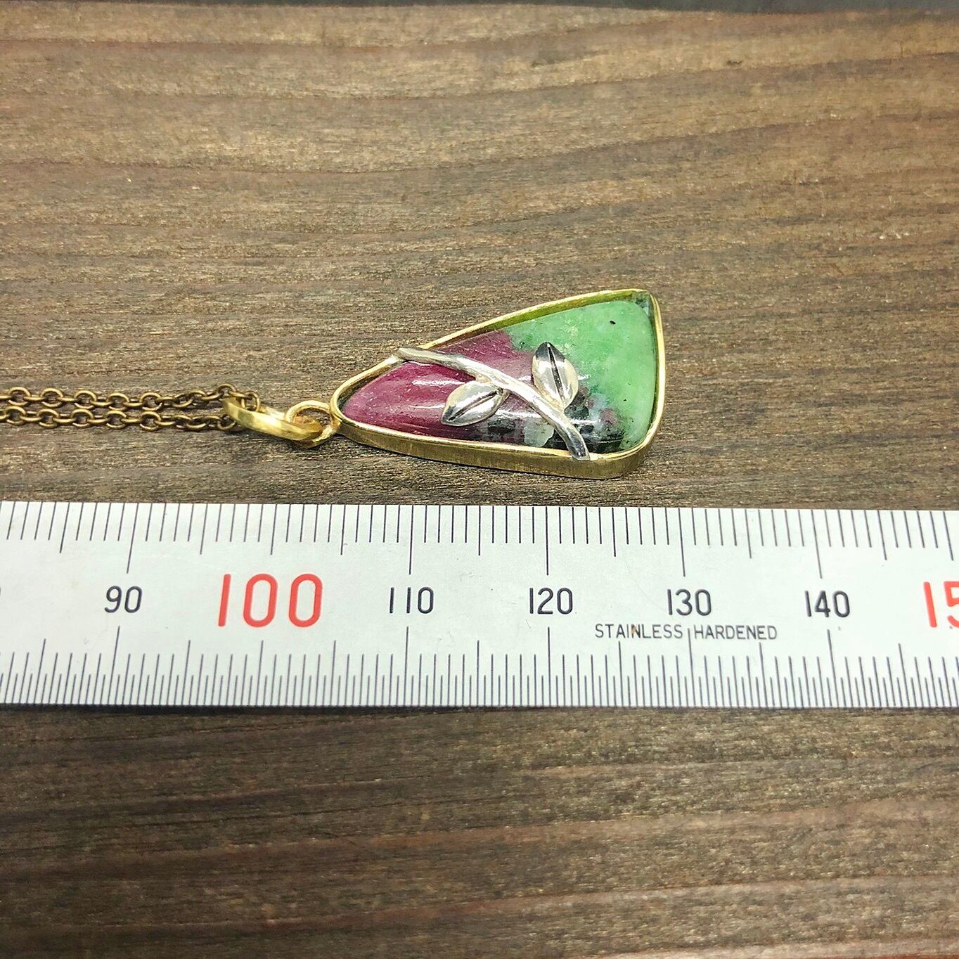 ピンクと緑色がポップな印象のちょっと歪な三角形をしたルビーインゾイサイトです。
