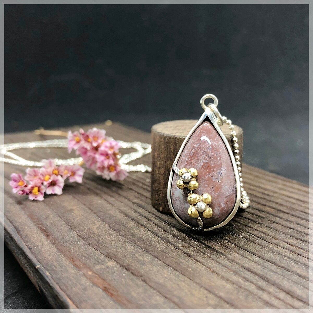 くすんだピンクが可愛い雫型のアゲートを使ったシルバーネックレスです。
