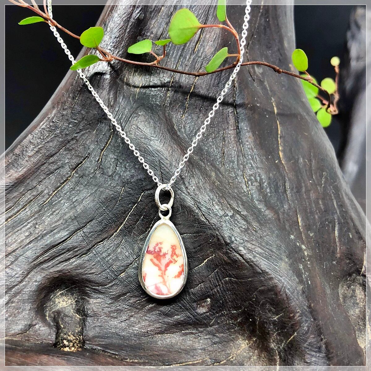 赤色の樹木模様が印象的な小さめのデンドリティックアゲートを使ったネックレスです。