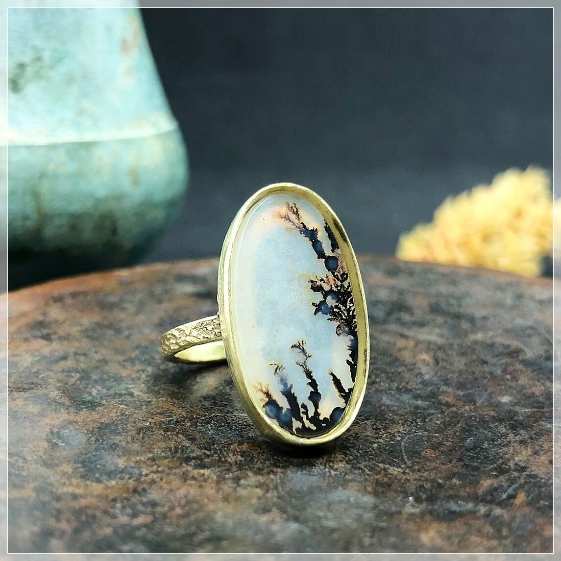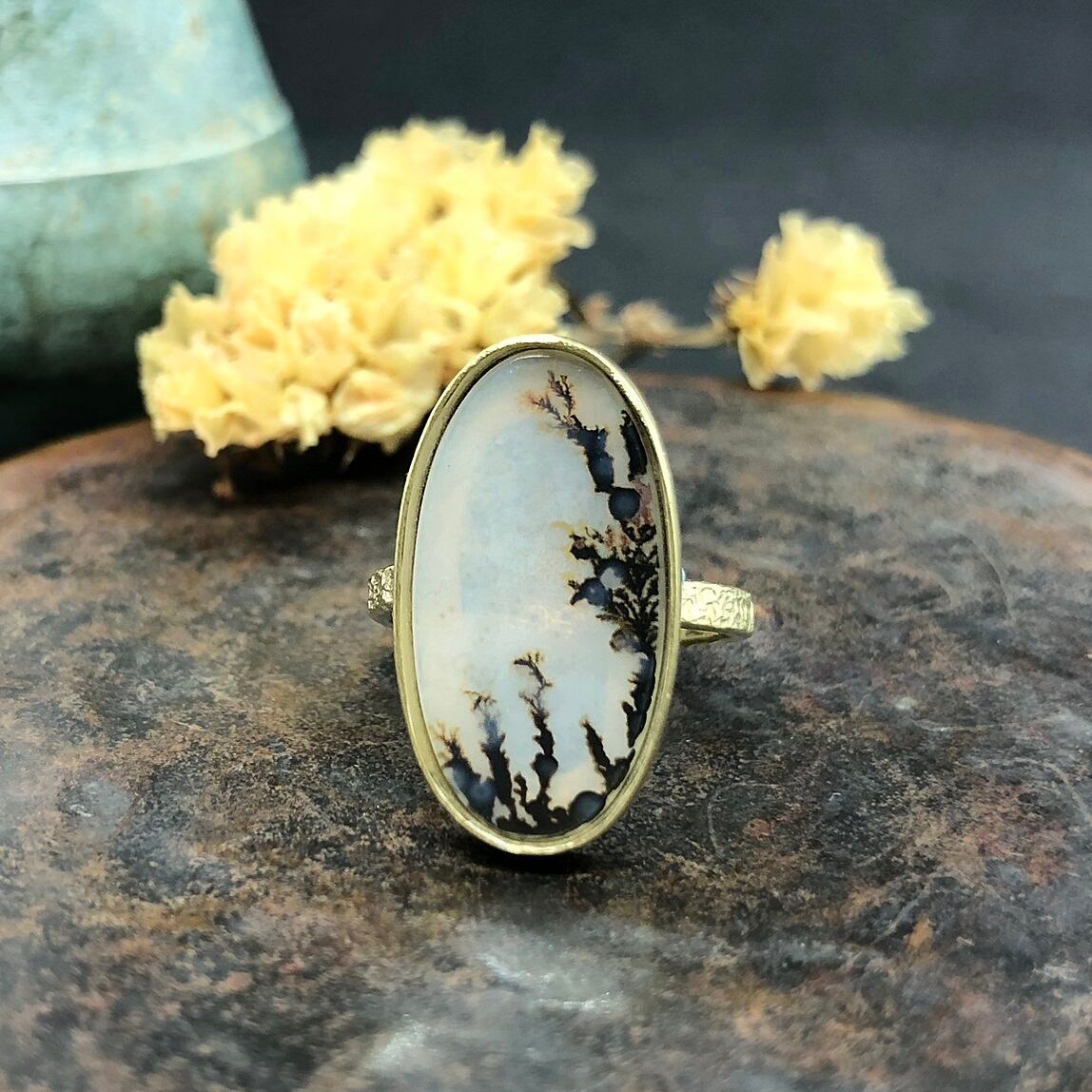 美しい絵画のような花模様が見える縦長楕円のデンドリティックアゲートです。