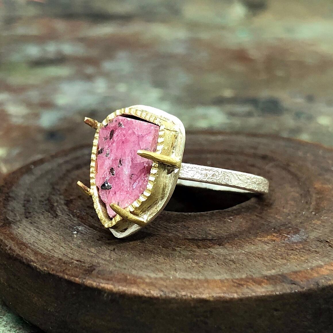 ゴツゴツ粗削りのルビー原石にシルバーと真鍮でゴージャスな印象のフレームに仕上げ、爪を合わせてみました。