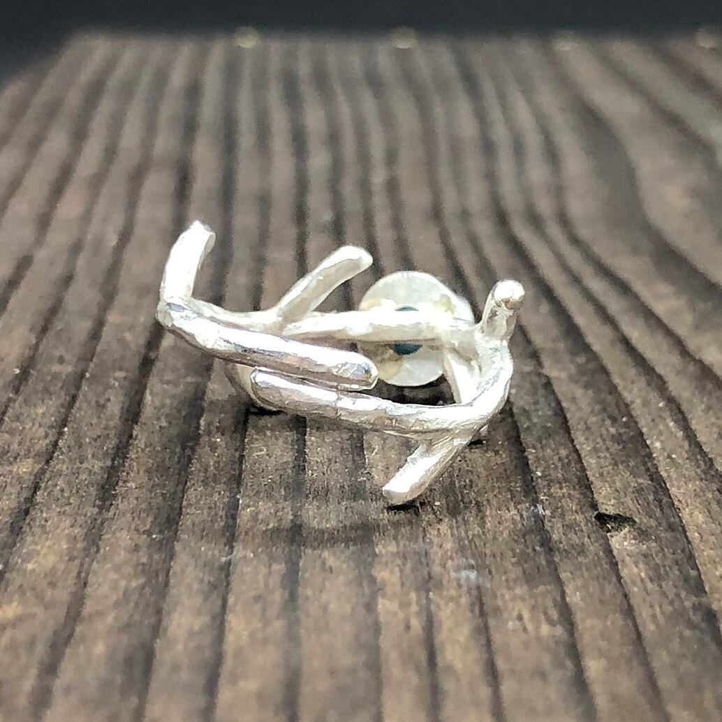 水色が控えめで小さなラリマーだったので、あえてワイルドな感じで枝をイメージしたアームを合わせました。