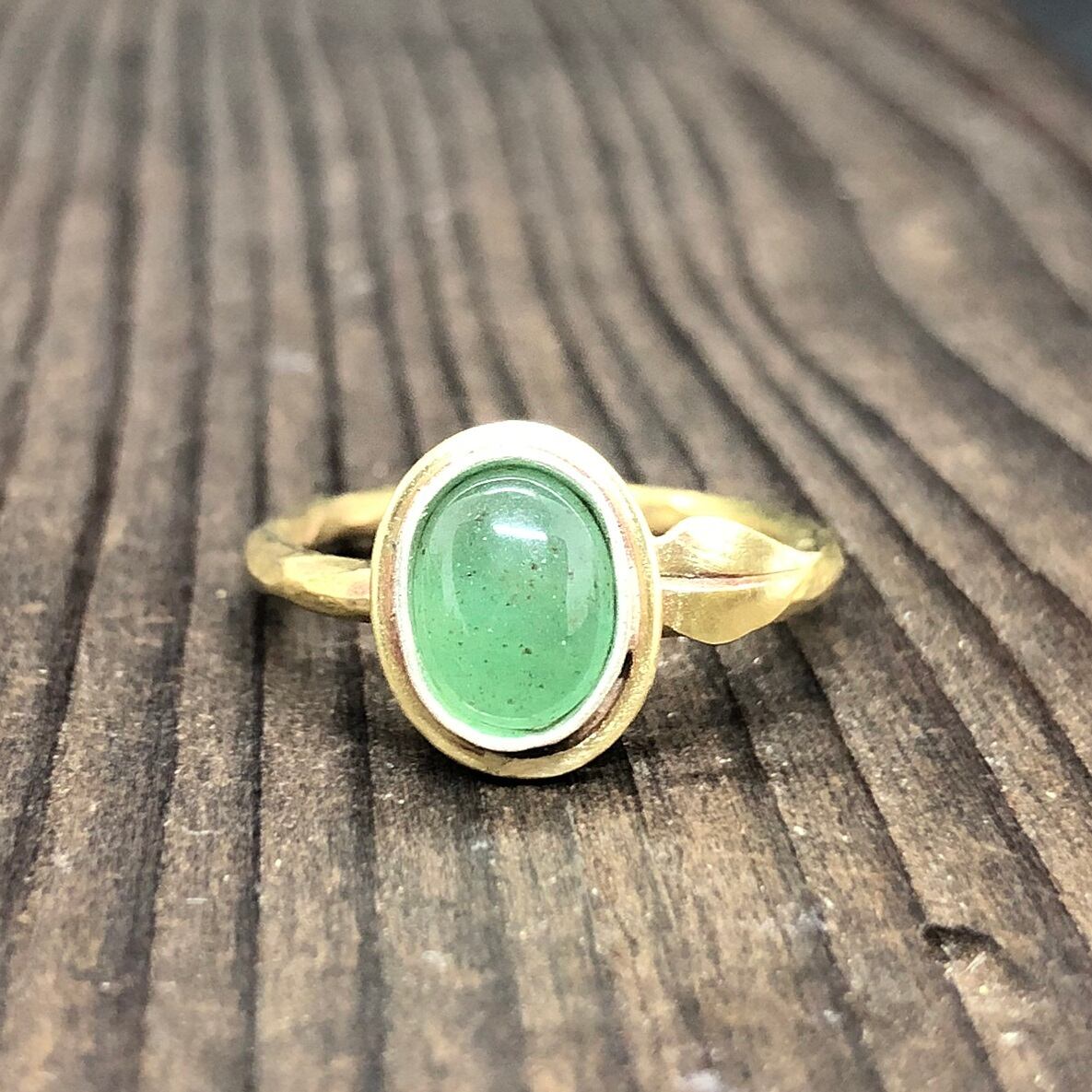 グリーンが爽やかなアベンチュリンがオリーブの実みたいに見えたので石周りをシルバーで囲み、更に真鍮を足して丸みを帯びた感じで仕上げました。