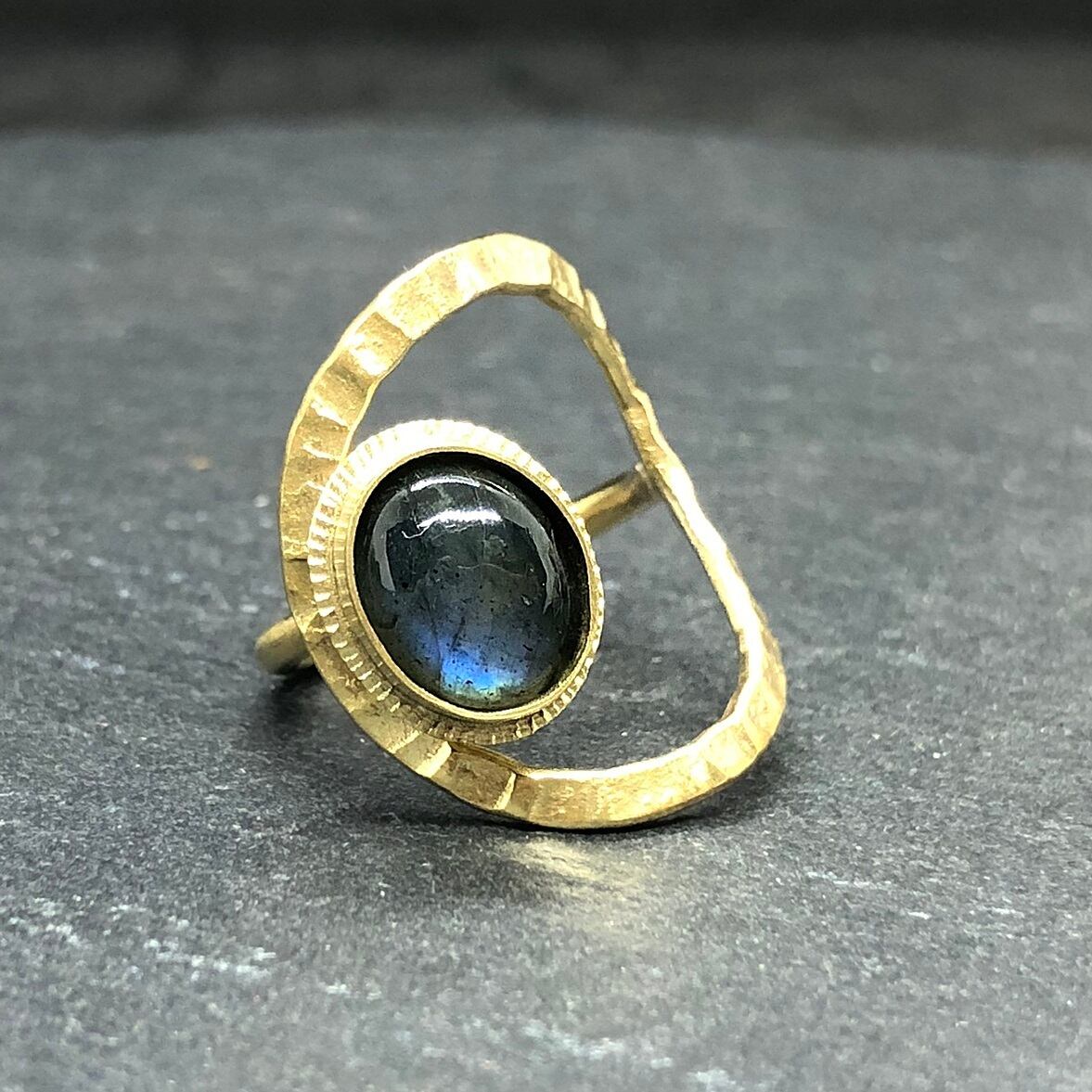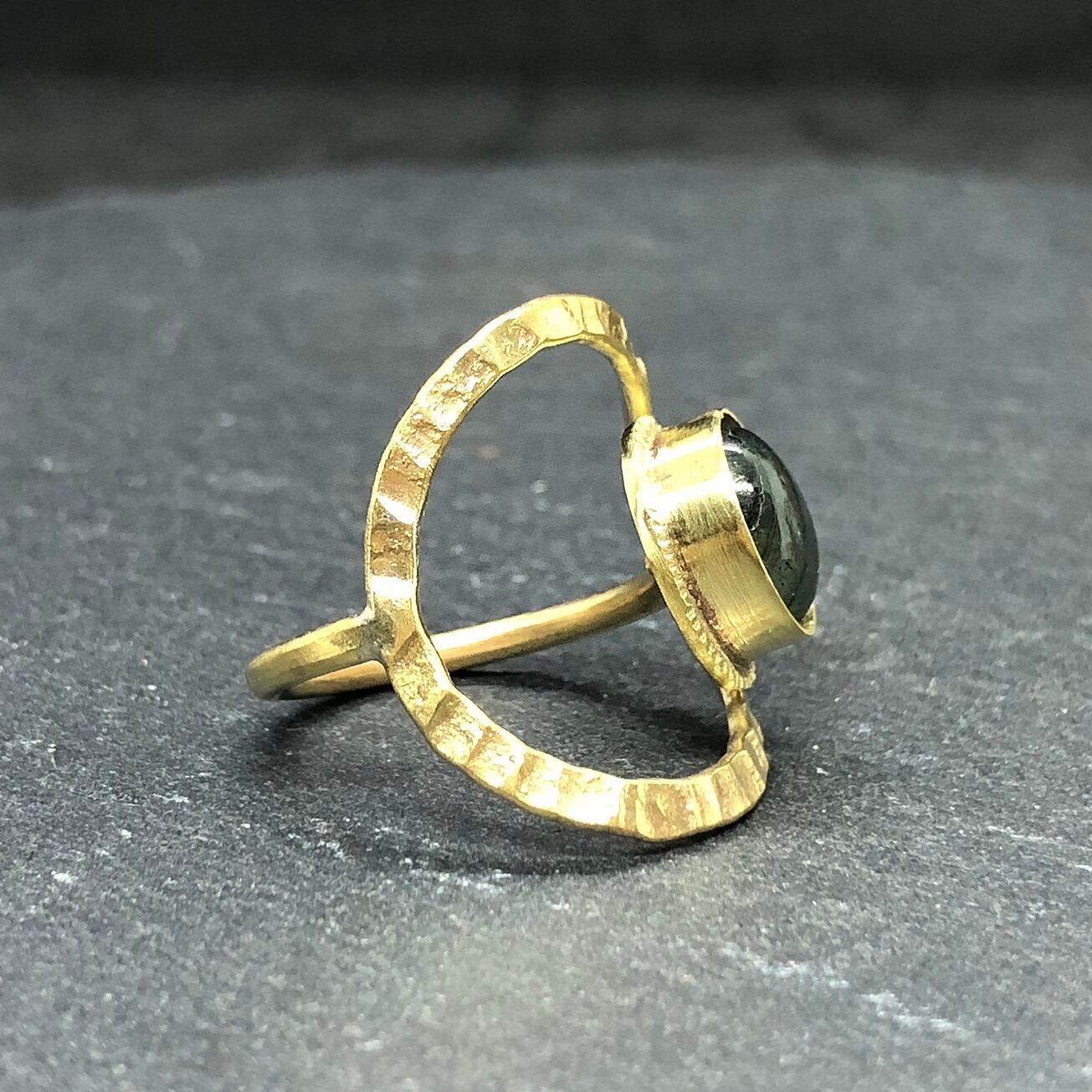 輪っかには粗い槌目を入れて、真鍮の石枠の周りは細かく飾りを入れて仕上げています。