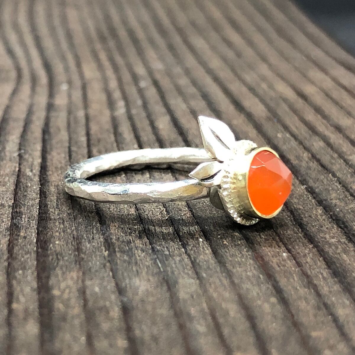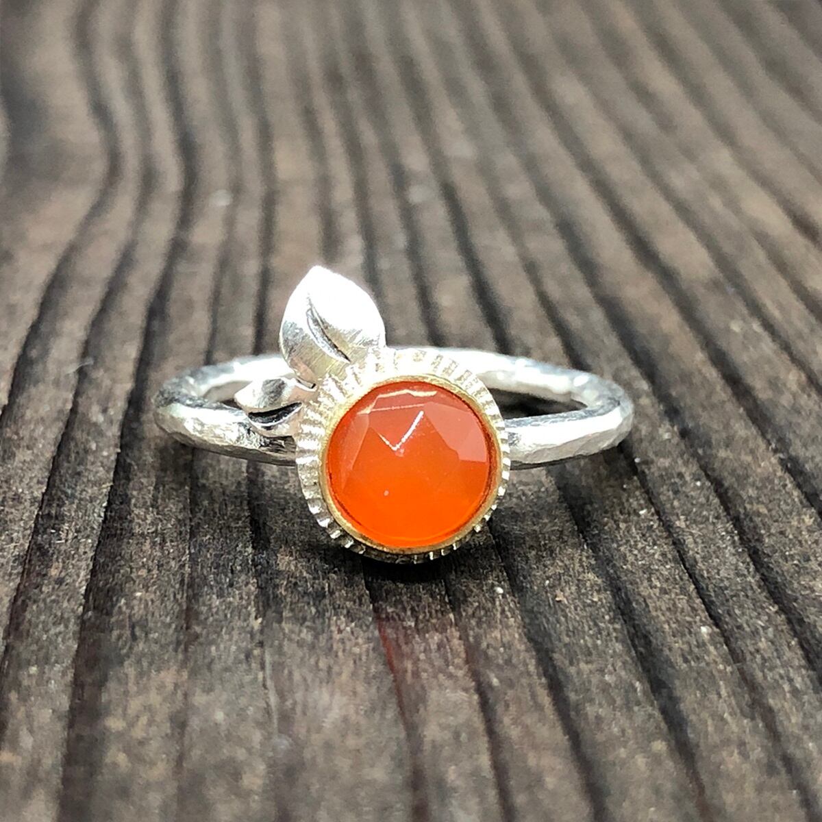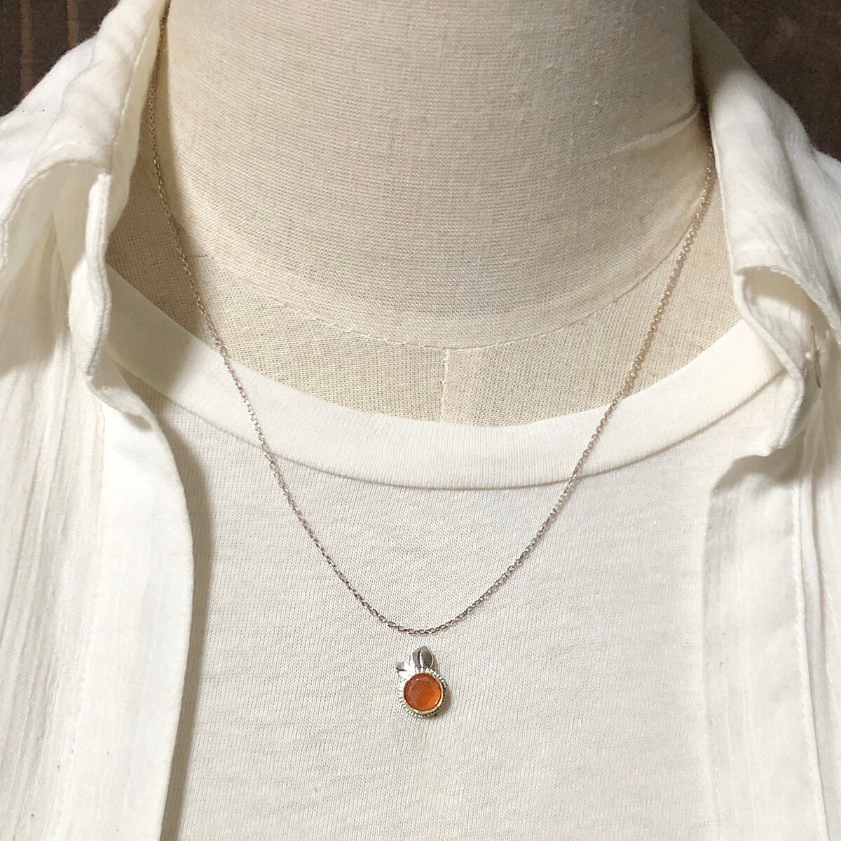 綺麗なローズカットのカーネリアンをオレンジに見立てて石枠は真鍮で、その周りはオレンジの輪切りのイメージでシルバーに細かな飾りを入れました。