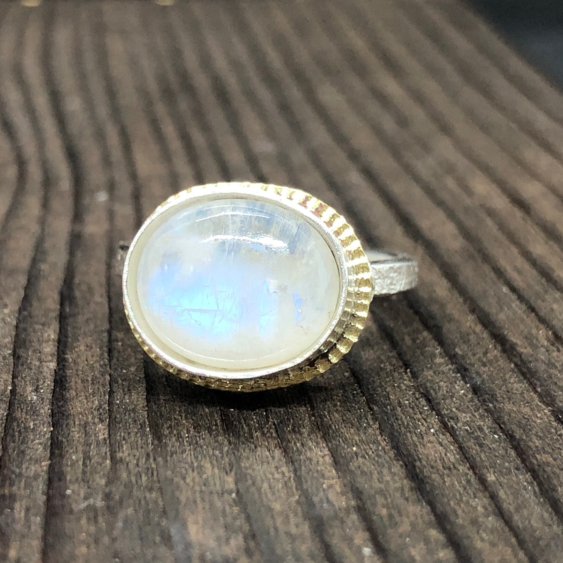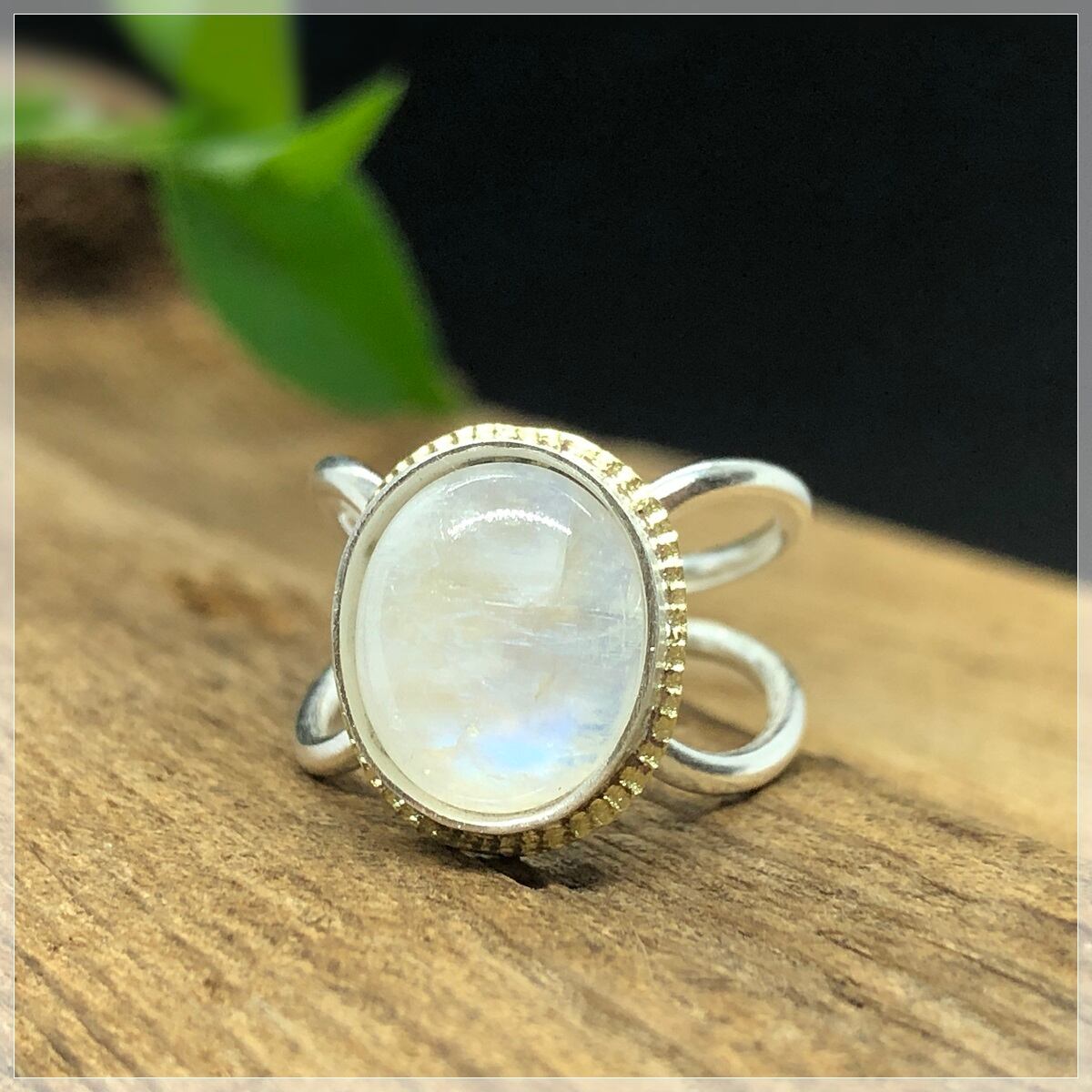 石枠はシルバーで、その周りは真鍮で細かな飾りを入れ石を引き立てています。