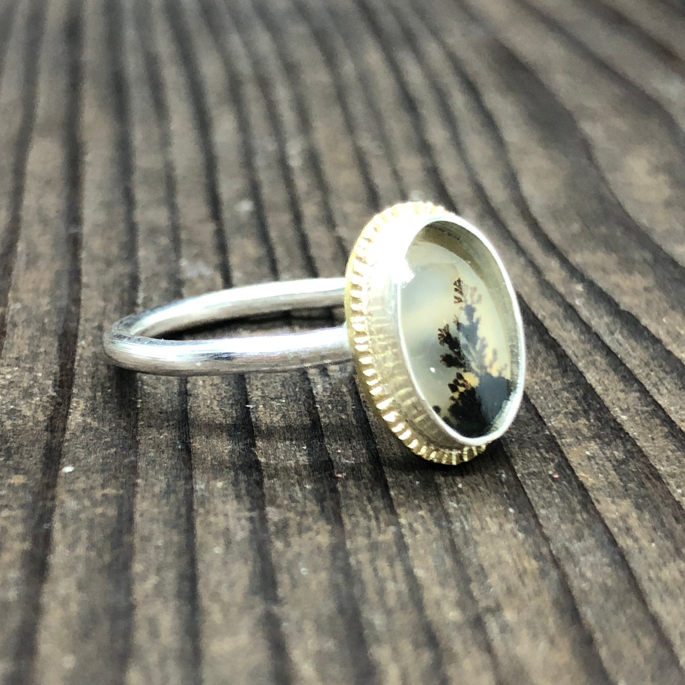 石枠はシルバーでシンプルに、周りは真鍮にして細かな飾りを入れて石を引き立てました。