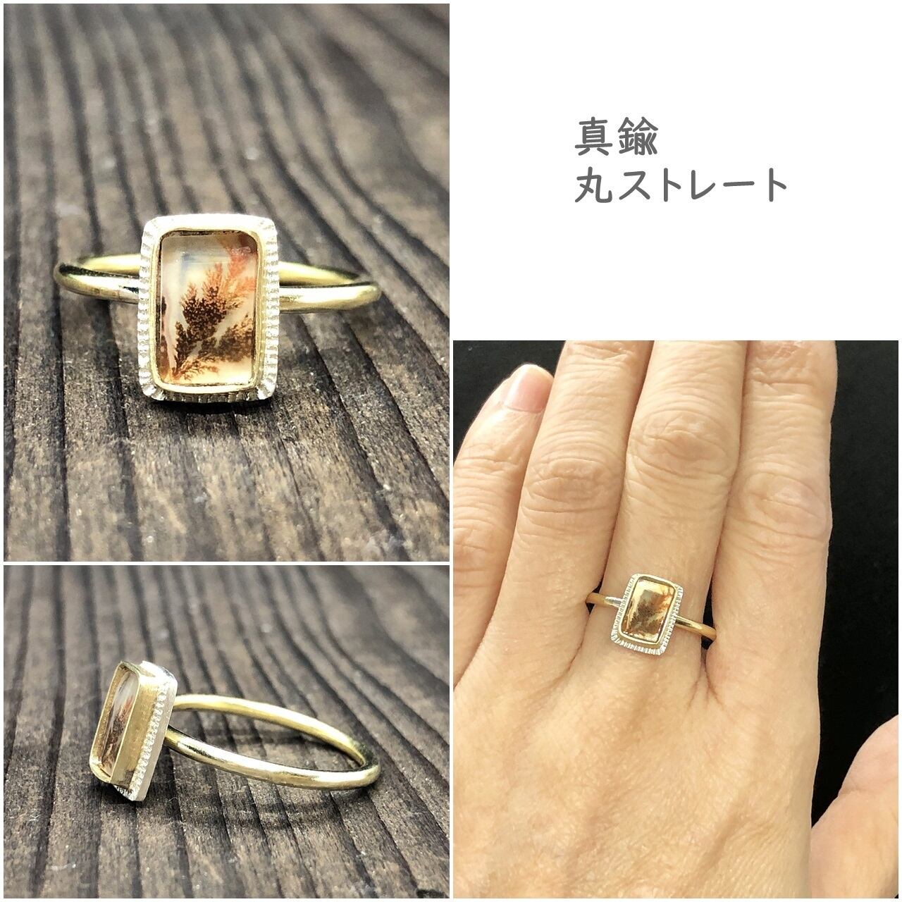 石枠は真鍮でシンプルに、周りはシルバーにして細かな飾りを入れて石を引き立てました。