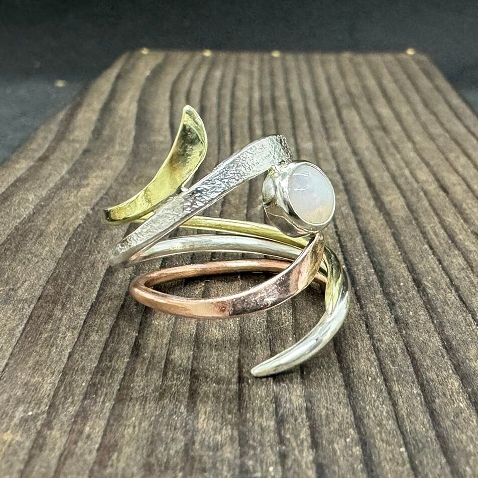 こちらの作品はシルバーと真鍮と銅の3つの金属を使って、流れるようなイメージのものを作りたいと思ってデザインした指輪です。