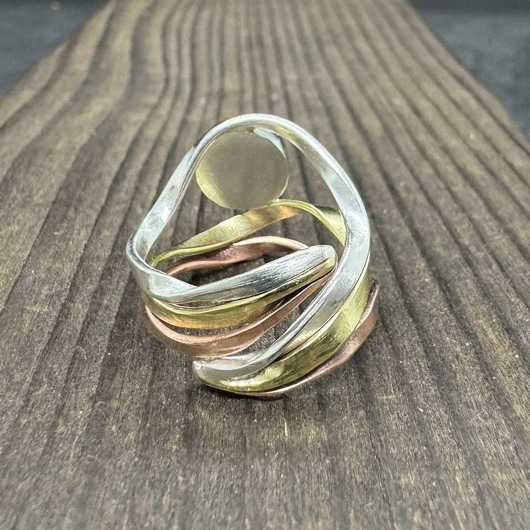 こちらの作品はシルバーと真鍮と銅の3つの金属を使って、海の波のような大胆な動きのあるものを作りたいと思ってデザインしました。