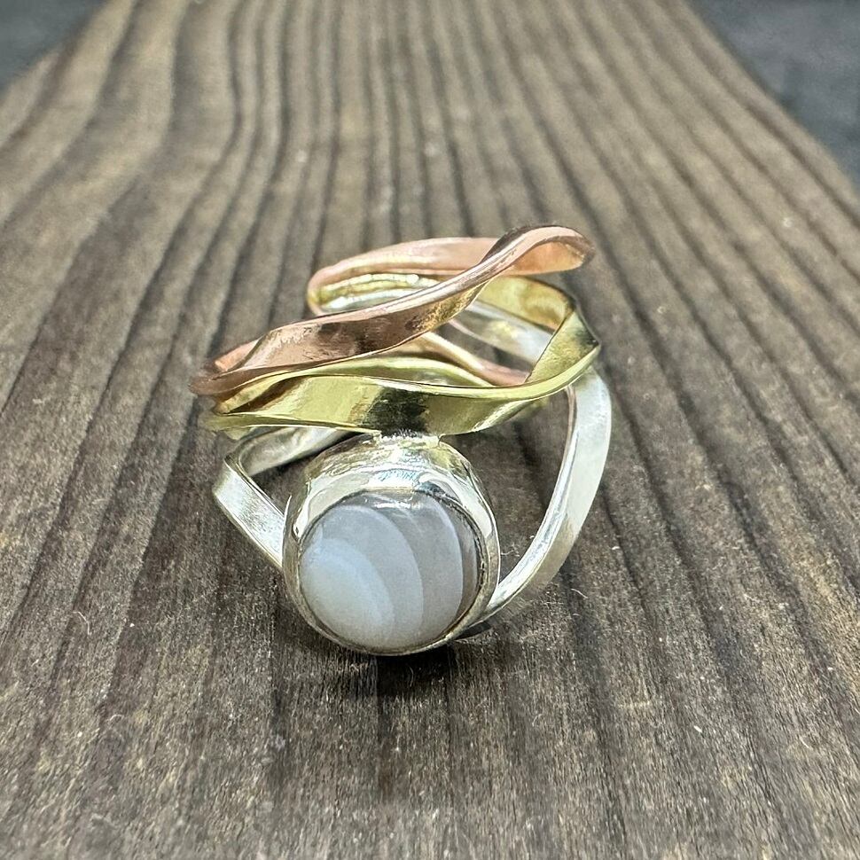 そのイメージに合う石がしっかりしたサイズ感があって、縞模様が個性的なボツワナアゲートでした。