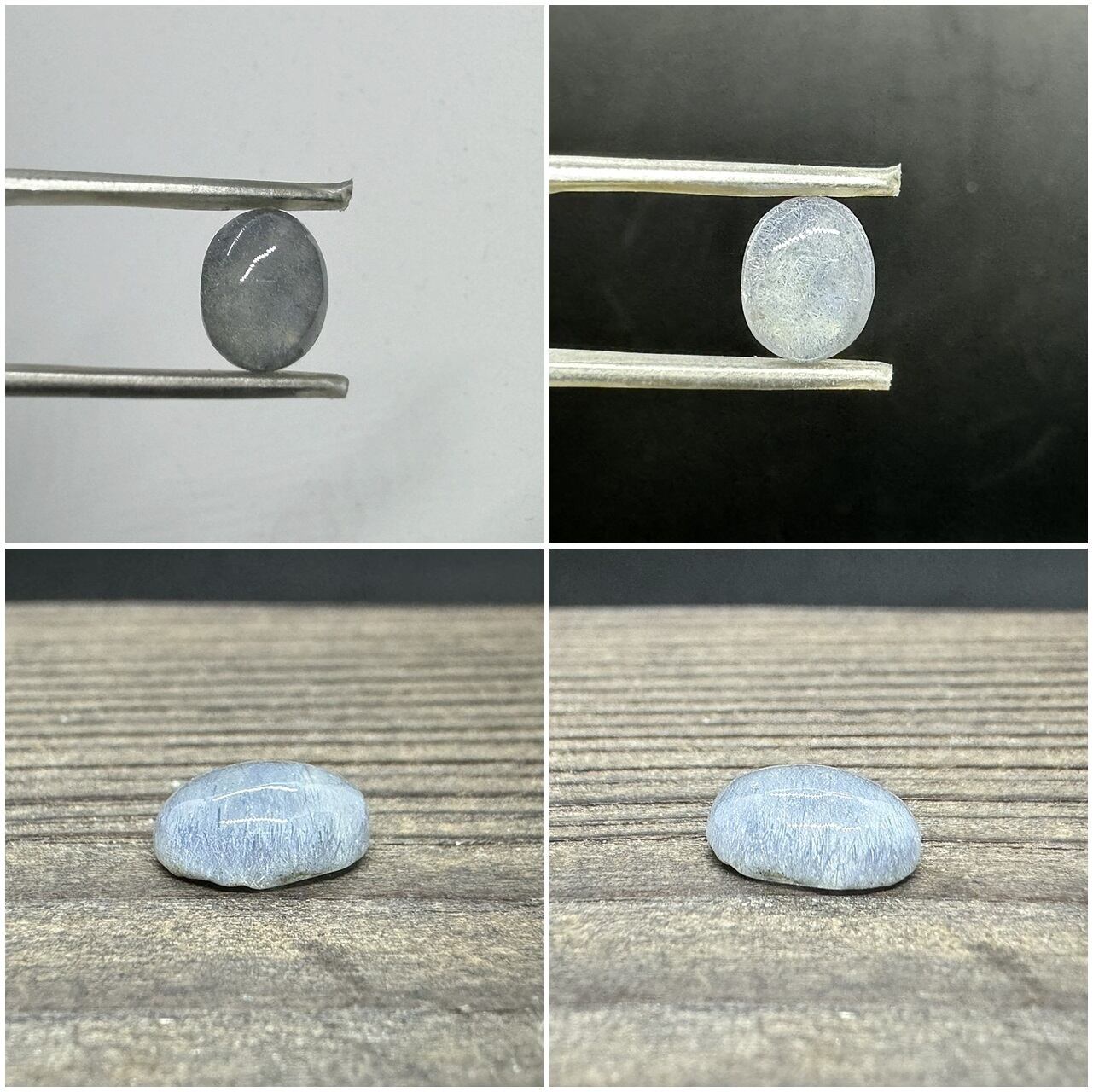 透明なクォーツの中にくすんだ水色の針がいっぱい詰まっています。