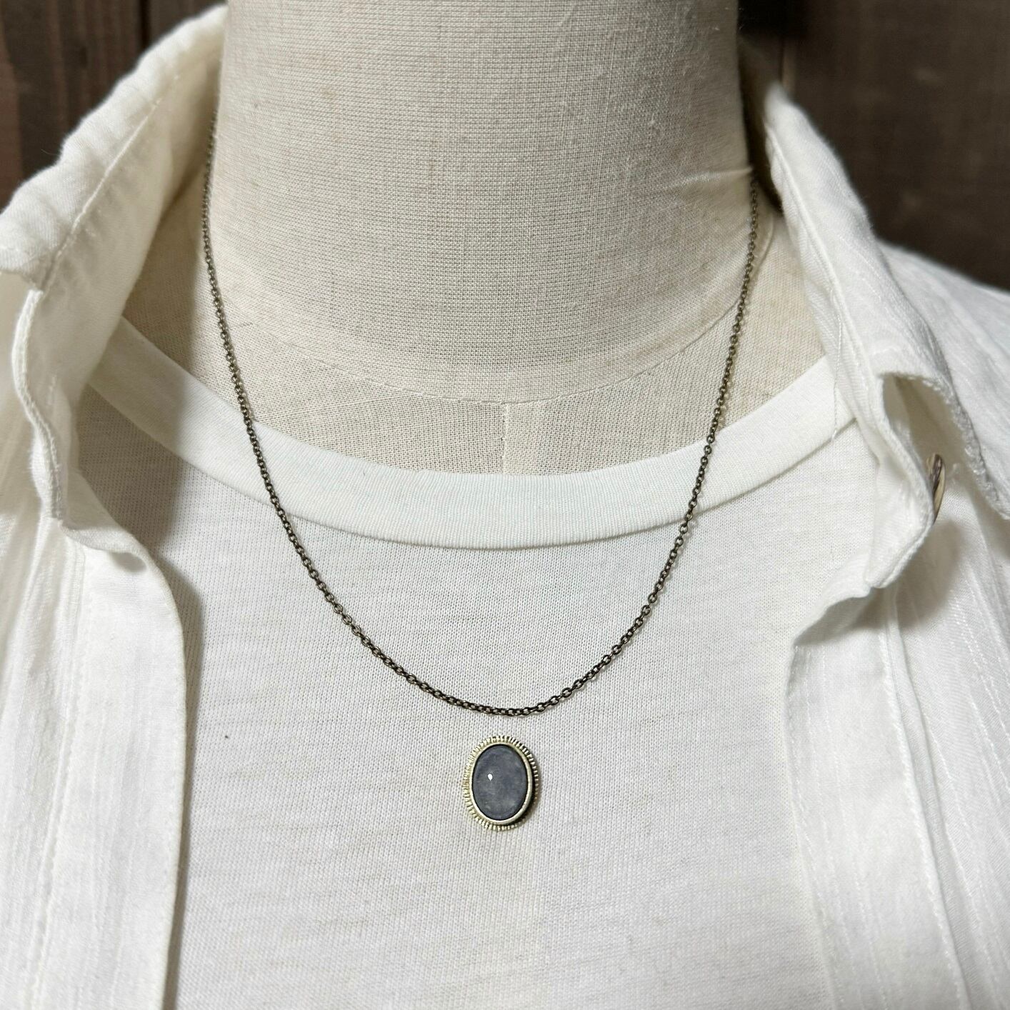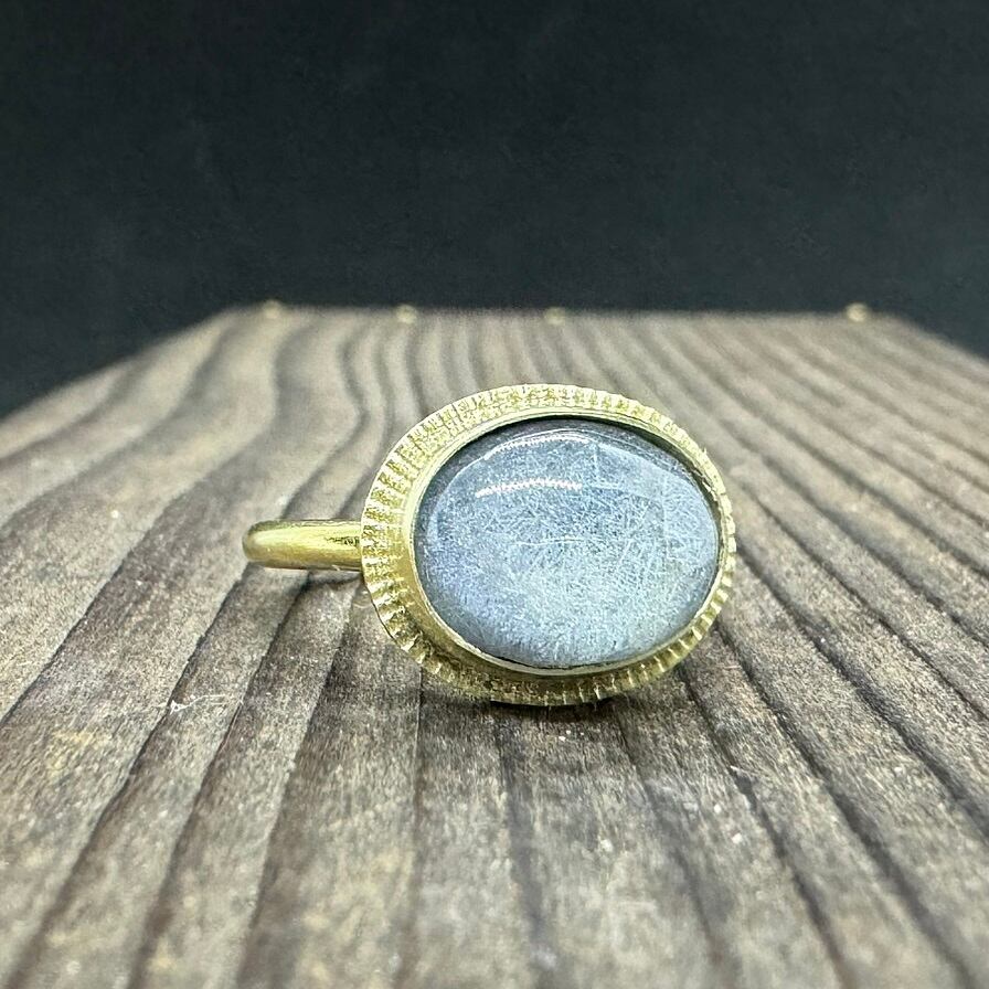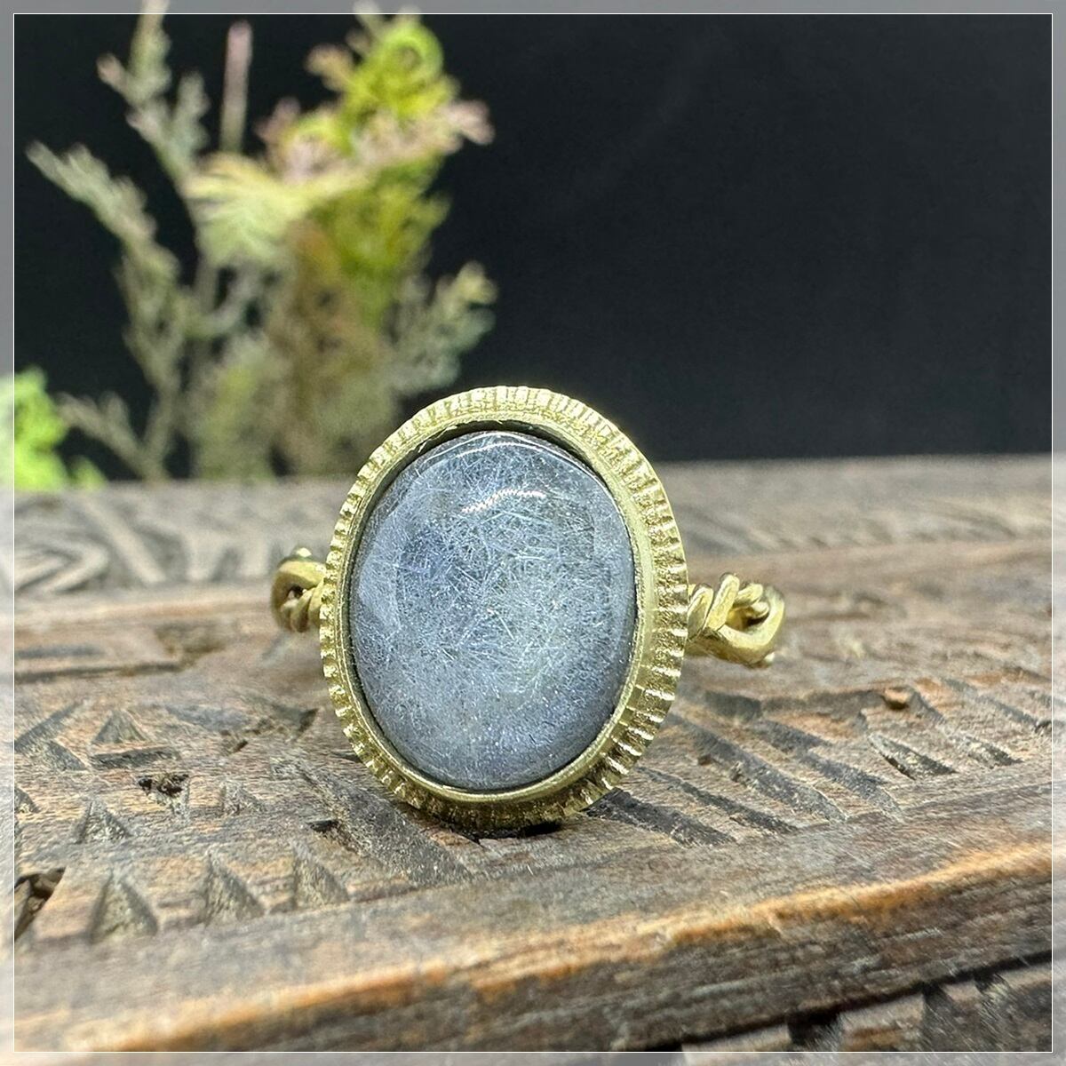 落ち着いた雰囲気の石には真鍮の枠を合わせ、周りを細かく飾り石を引き立てました。