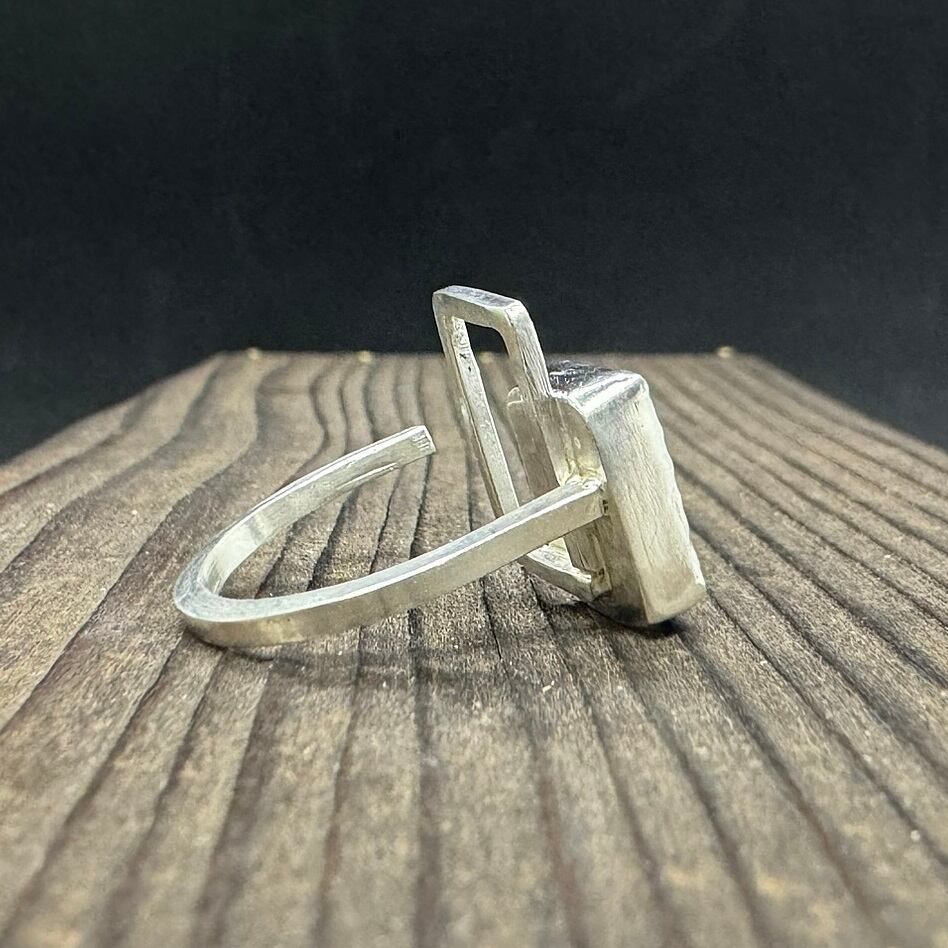 四角い石に更に四角のシルバーの枠を合わせて、アーム部分も四角いシルバー線を使用しました。