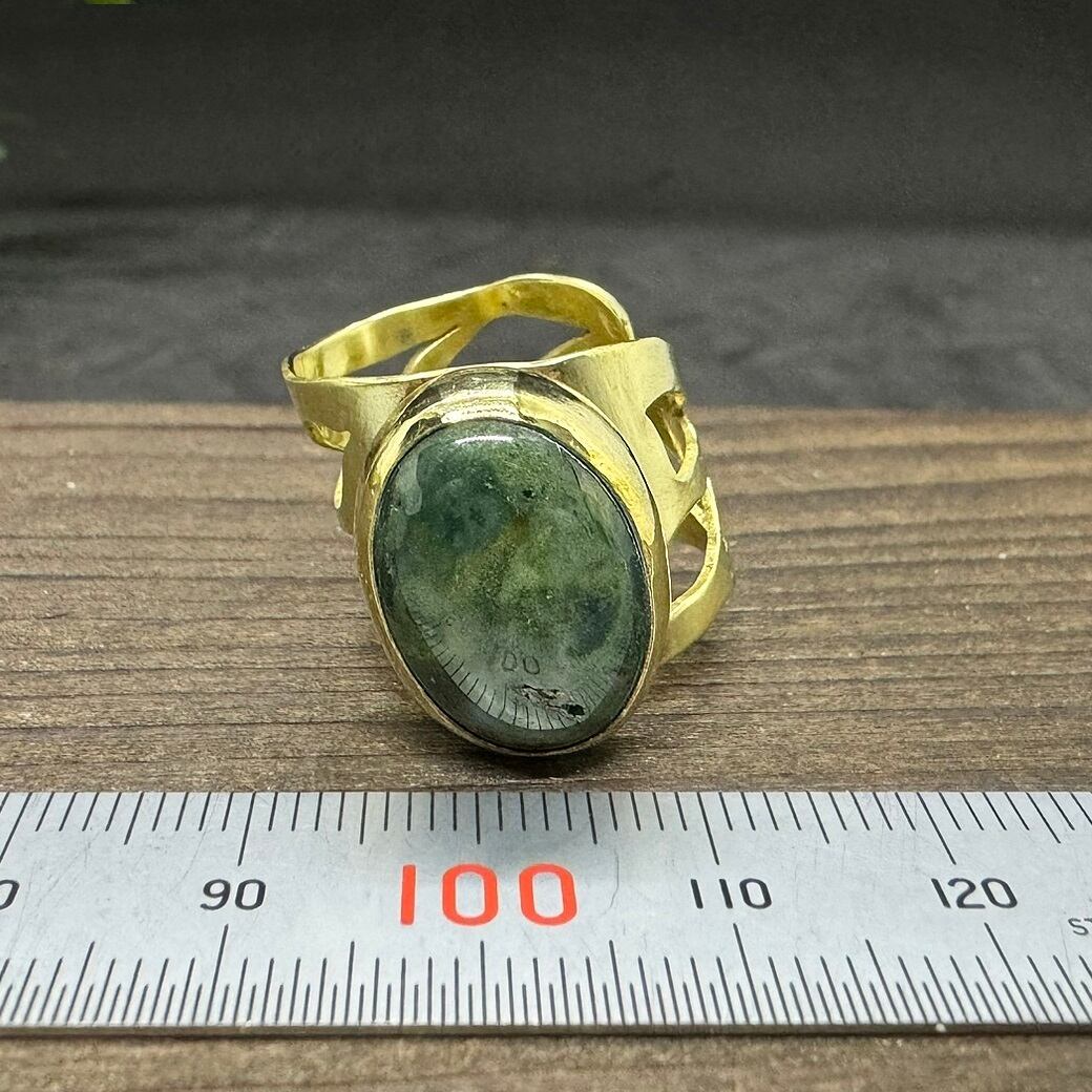 しっかりしたサイズ感のあるモスアゲートは真鍮の枠を合わせ、アーム部分は幅広の透かし彫り風に仕上げました。