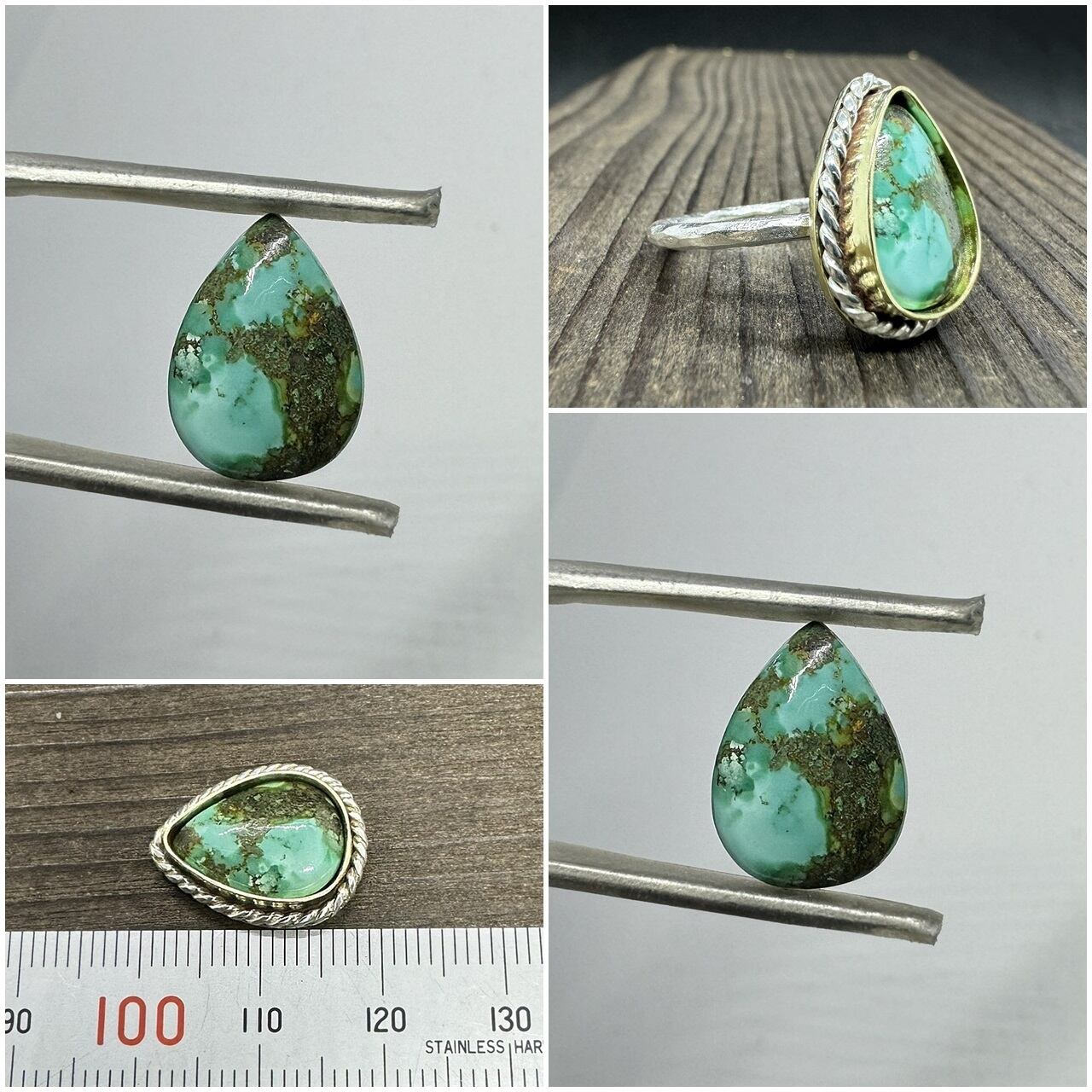 石周りは真鍮で囲み、更にシルバーの細かなツイスト線を飾ってアンティークな雰囲気に仕上げました。