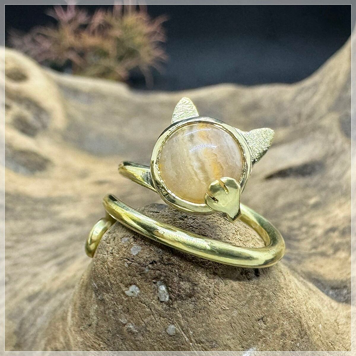 石を顔に見立てて真鍮で耳を作り、更にぷっくり丸い手も合わせました。