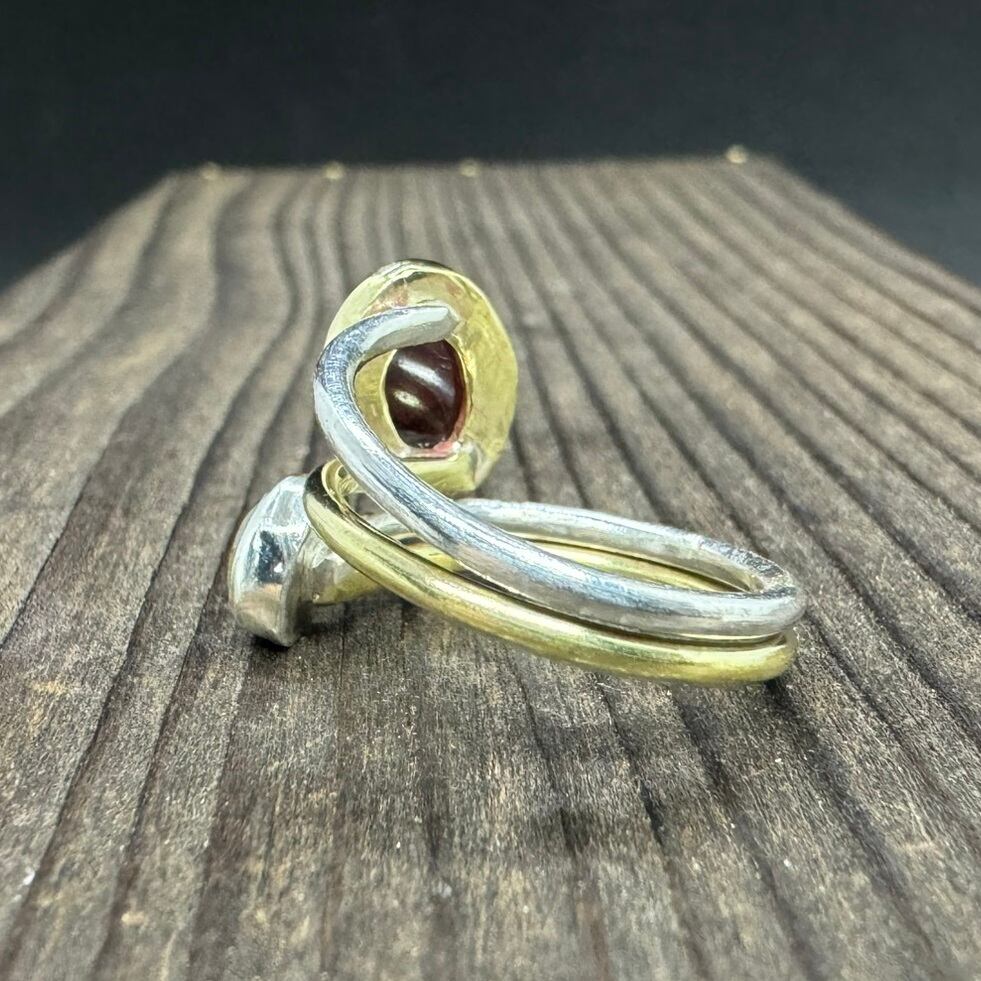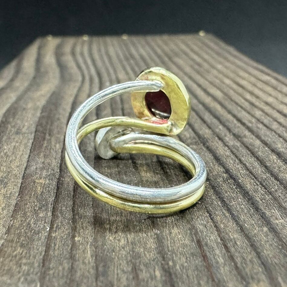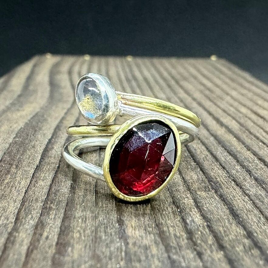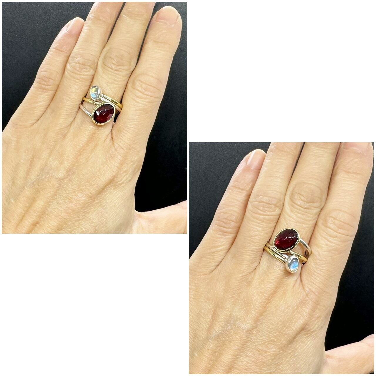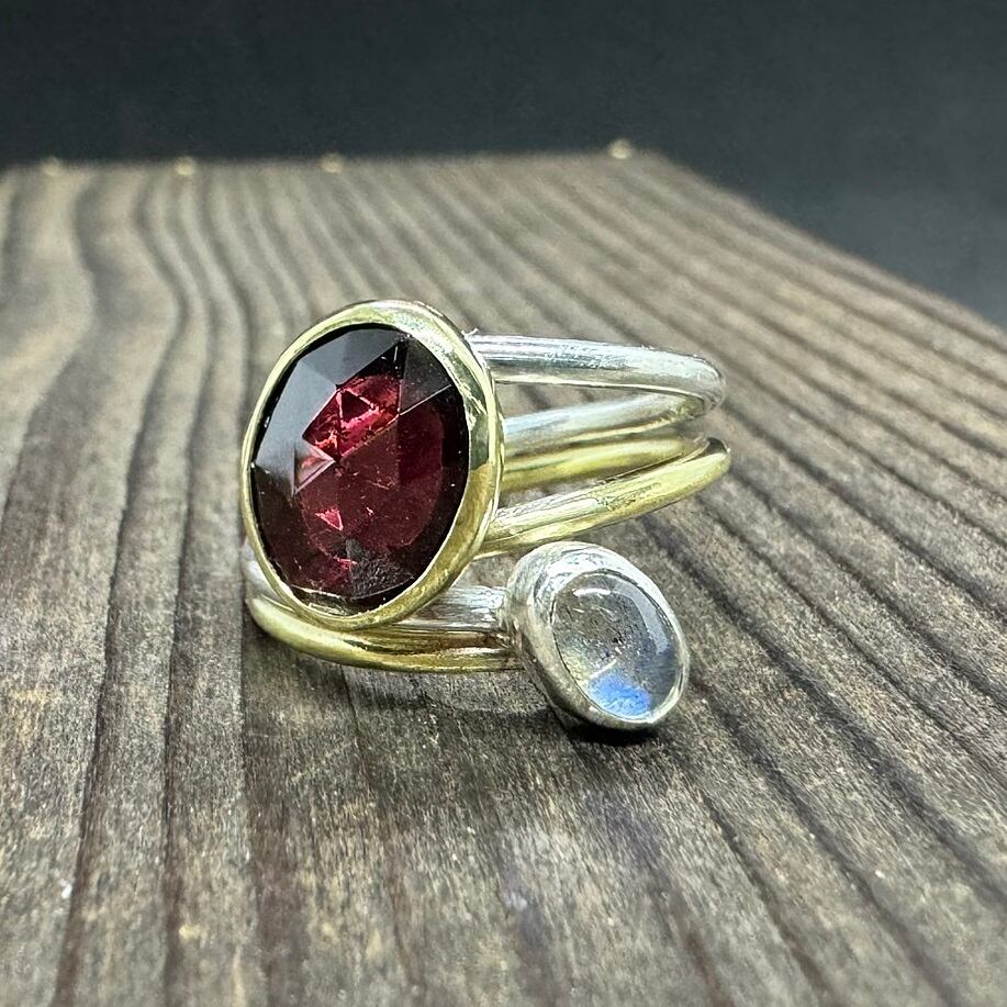 ガーネットは真鍮で囲み、ラブラドライトはシルバーで囲んで2色使いにしています。