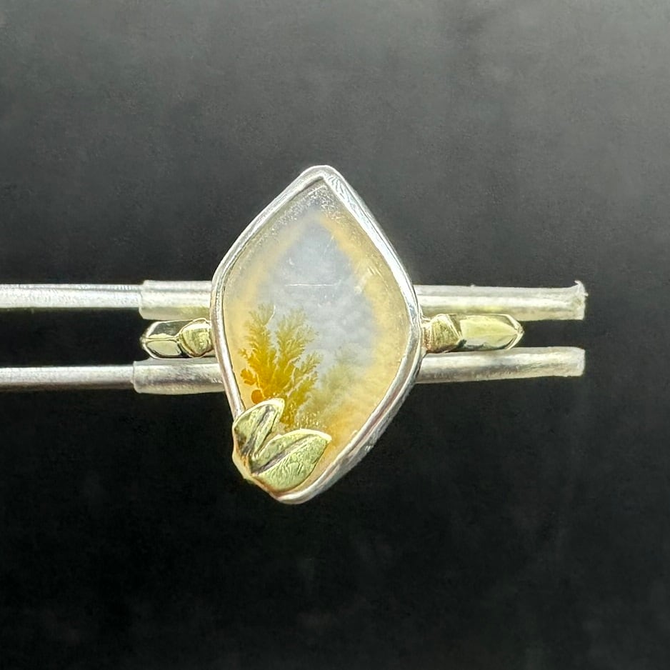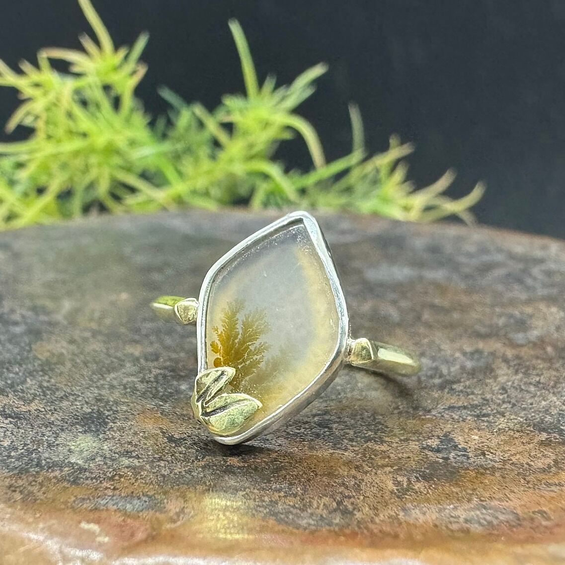 石はシルバーで囲み、樹木模様に合わせて真鍮の小さな葉っぱをアクセントに入れました。