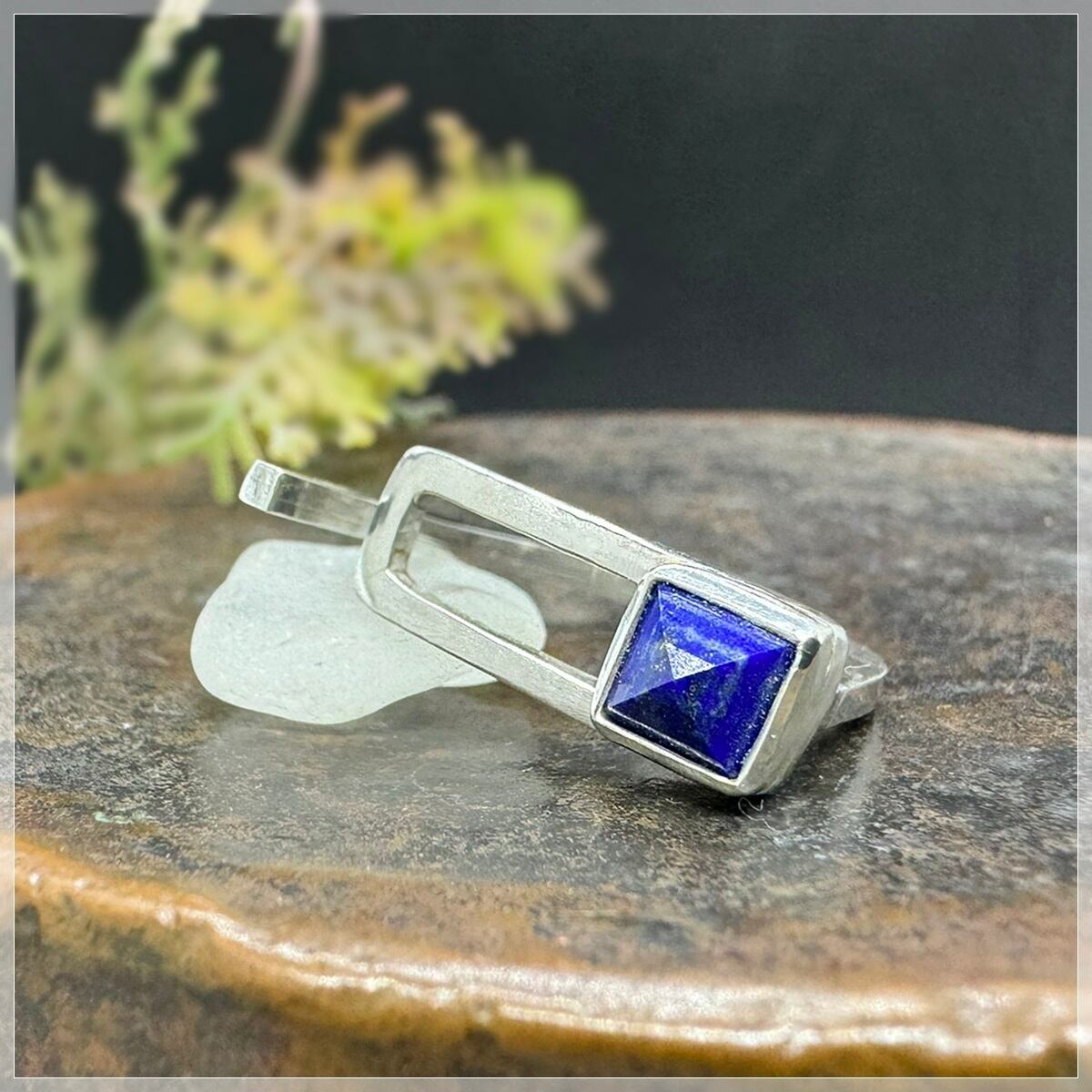 四角いシルバーの線を使い、更に長方形のモチーフを合わせて直線的な指輪にしています。