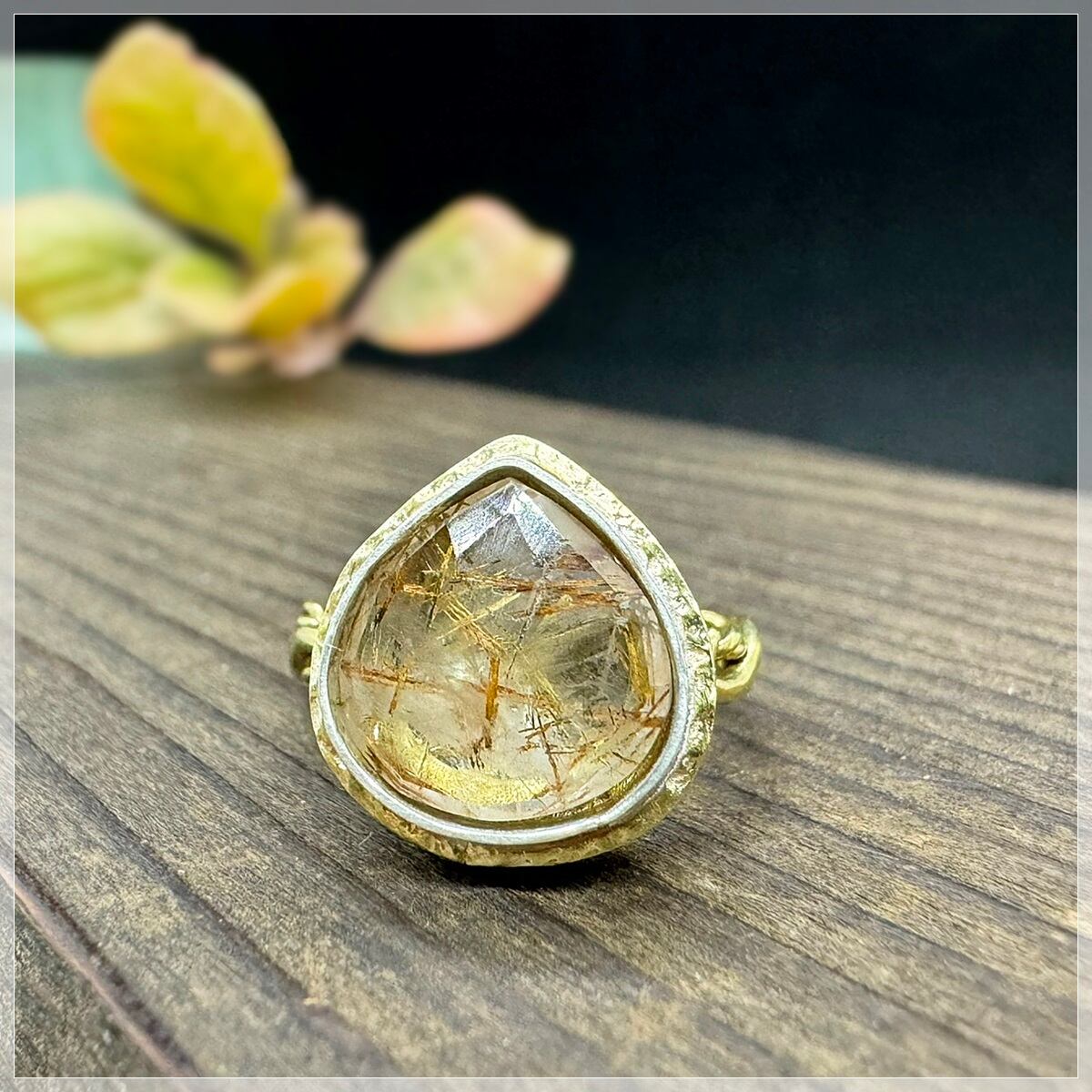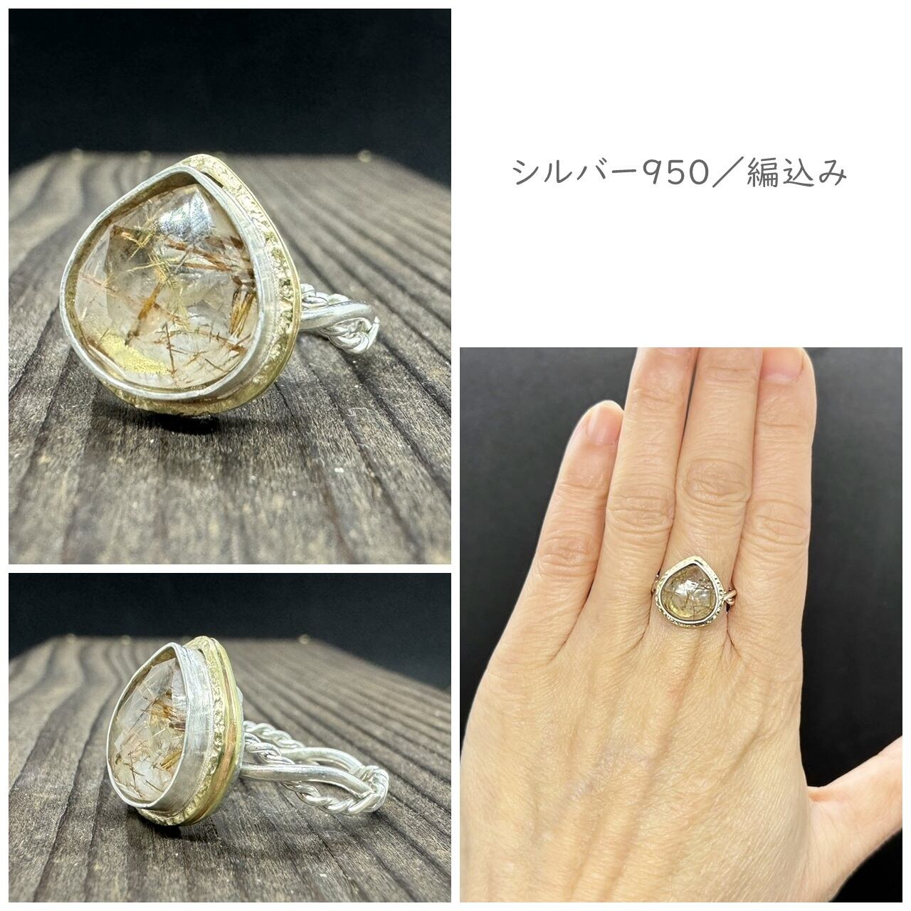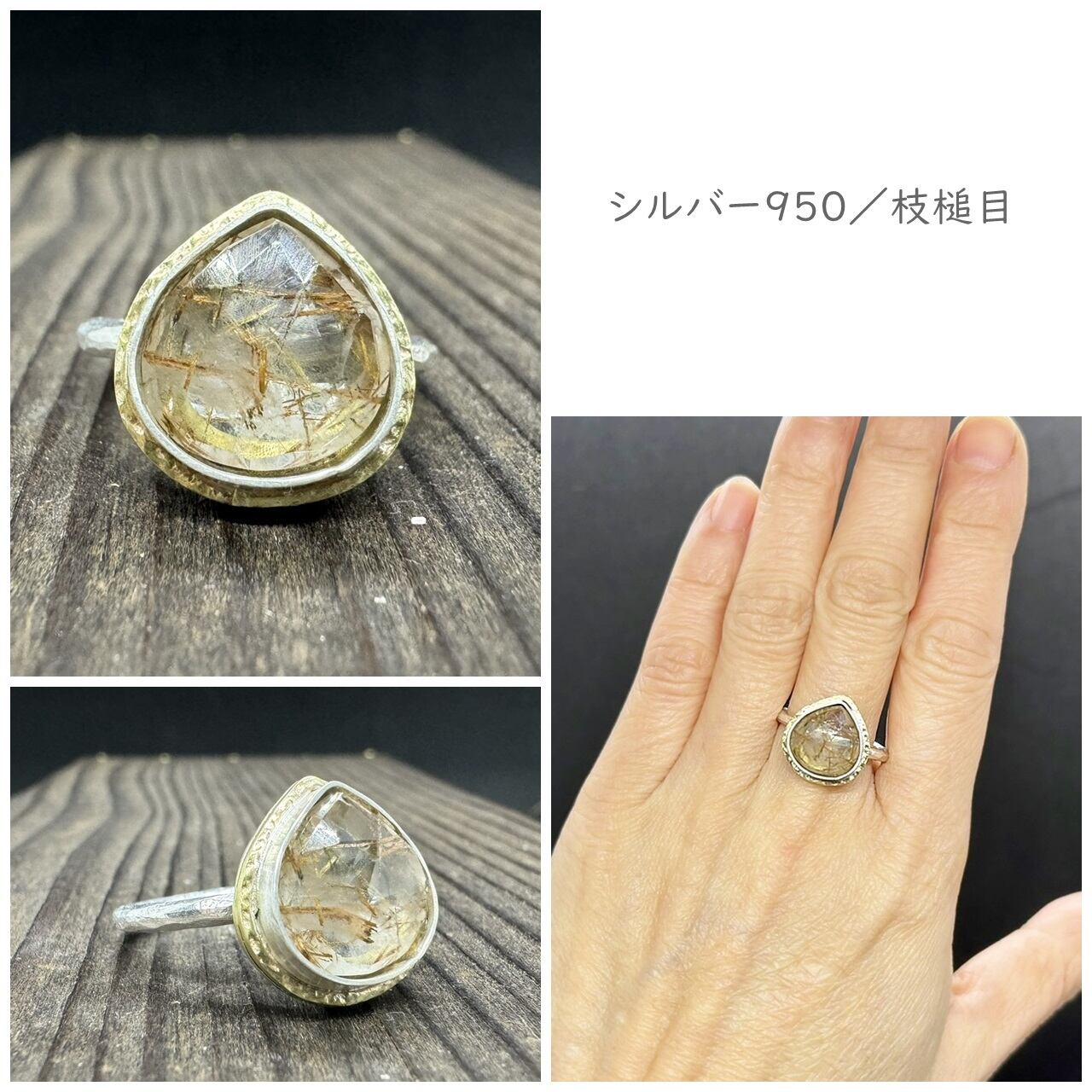 石枠にはシルバーを合わせ、その周りは真鍮で細かい槌目を入れて石を引き立てました。