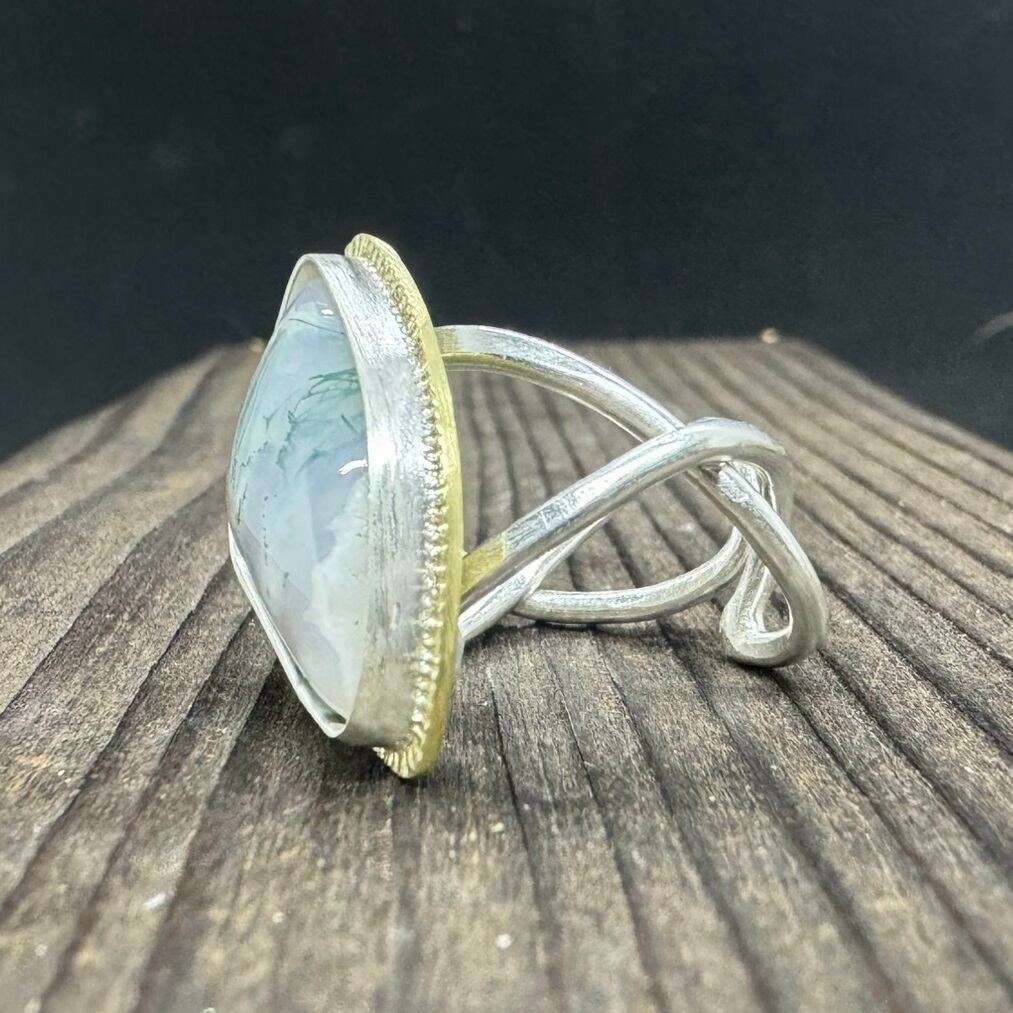 石の周りはシルバーで囲み、更にその周りは真鍮で細かく飾りを入れて石を引き立てました。