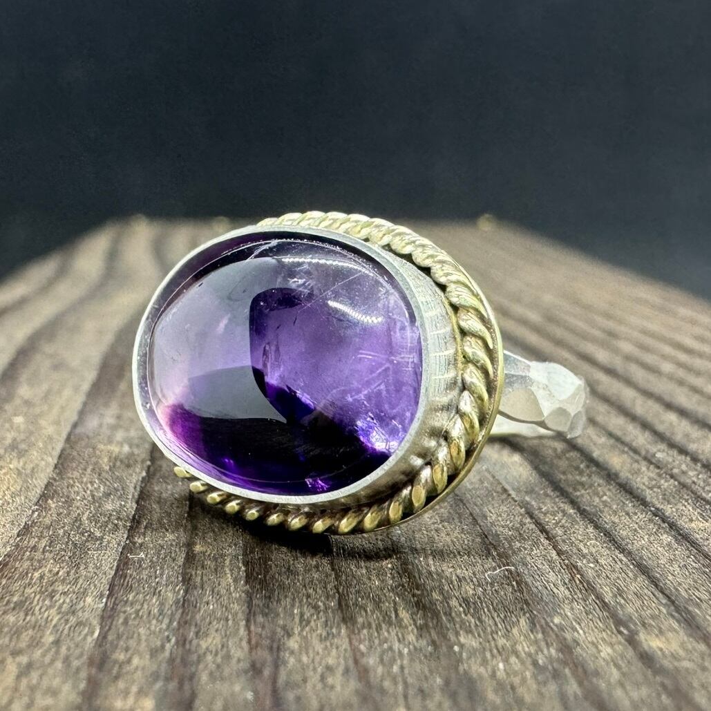 石周りはシルバーで囲み、周りは細い真鍮のツイスト線を加えてアンティークな雰囲気にしてみました。