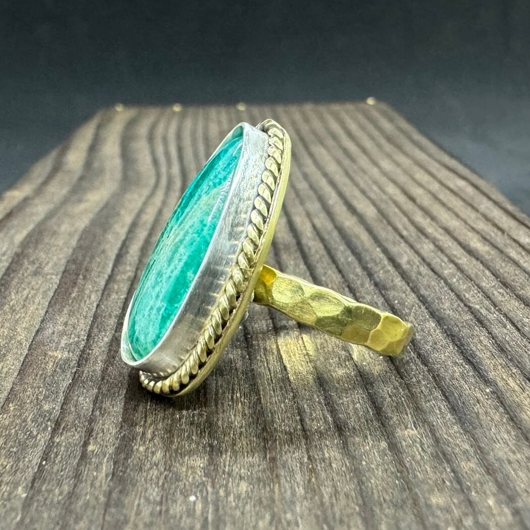 石の周りはシルバーで囲み、更に周りを真鍮の細かなツイストで飾り石を引き立てました。