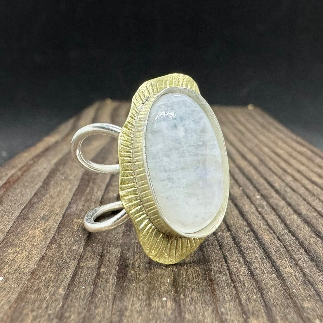 石枠はシルバーにして、周りをフワフワした花びらのような真鍮で飾り、石を引き立てました。