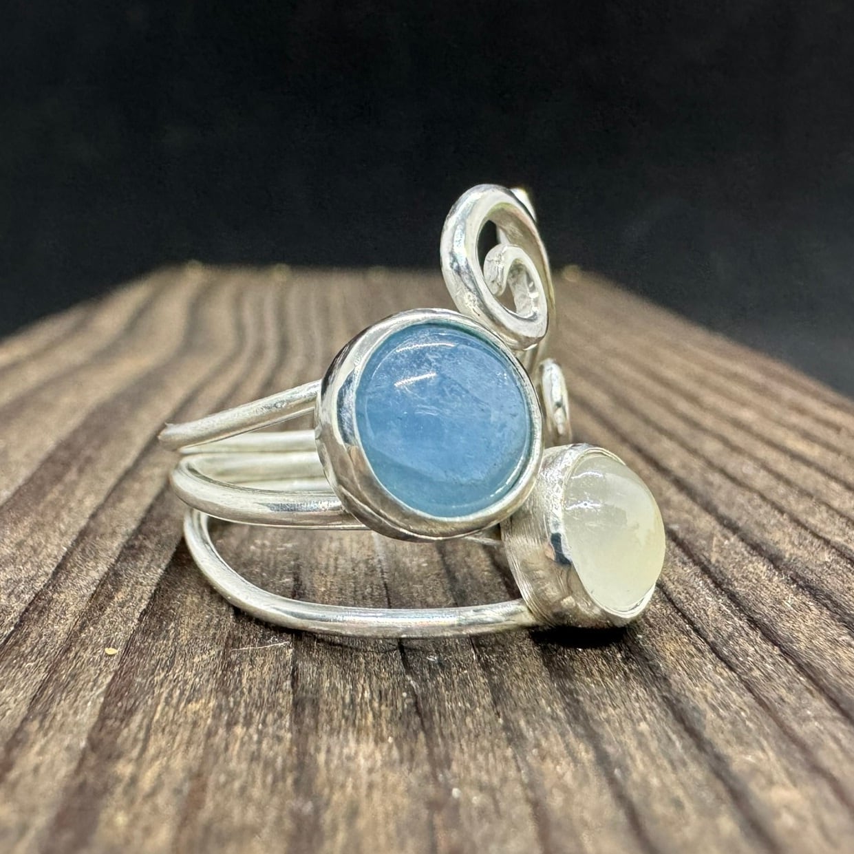 ミルキーな水色のアクアマリンと乳白色のムーンストーンです。